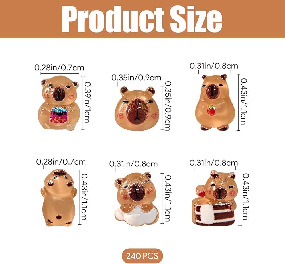 Contents & Size: Each set includes 240 pieces of mini resin capybara charms, each measuring approximately 0.35–0.43 inches, crafted from durable resin. The mini capybara figures come in multiple styles to ensure ample variety for all your projects
