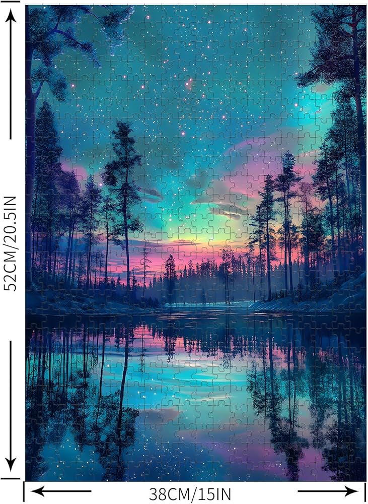 Aurora Puzzle: This jigsaw puzzles 500 pieces presents a captivating view of the night sky, appealing to those drawn to celestial wonders and the beauty of the starry heavens