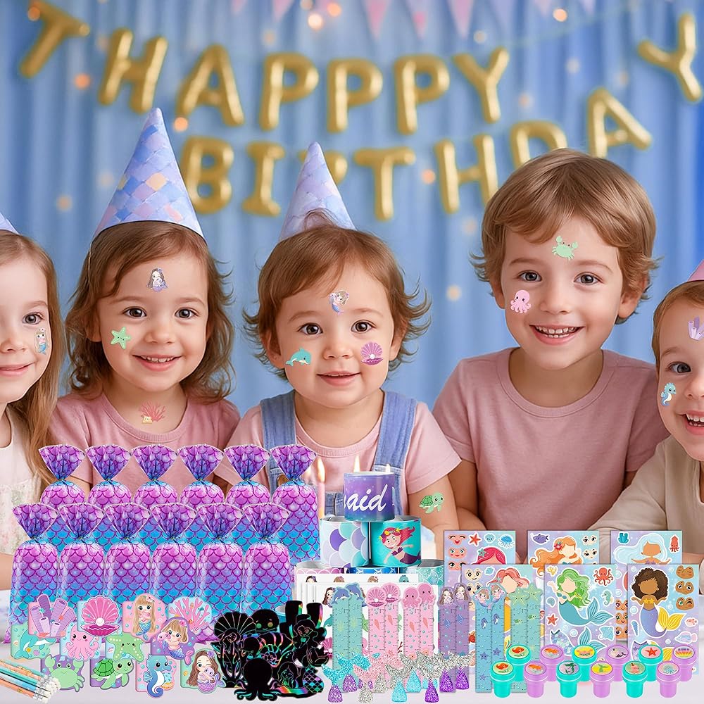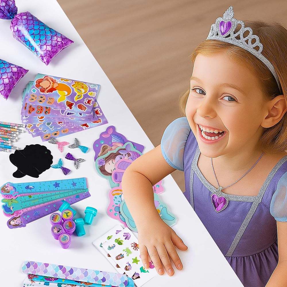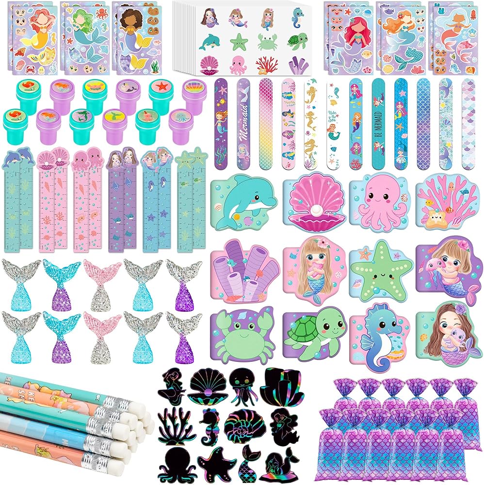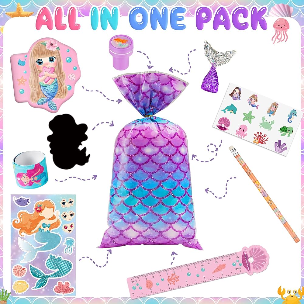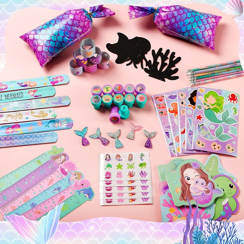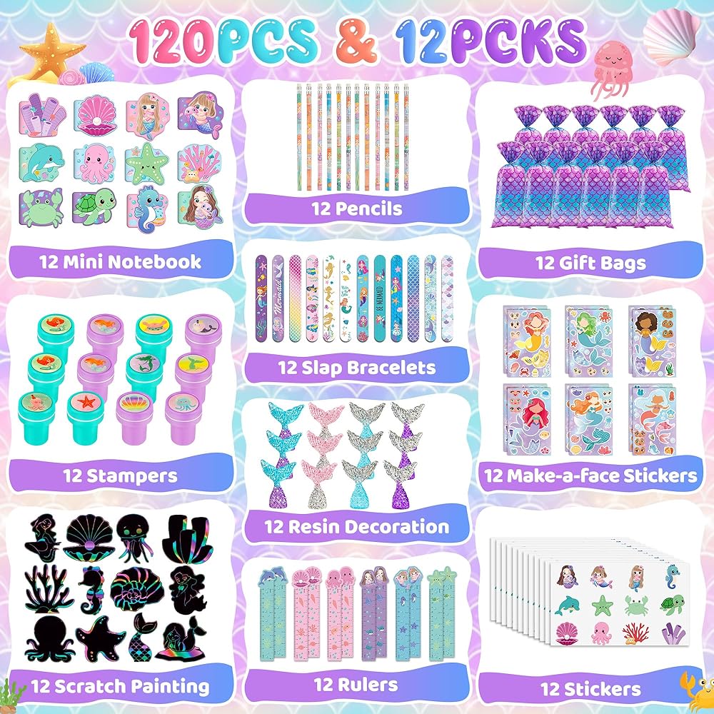 12 مجموعة من هدايا حفلات حورية البحر: تتضمن 12 دفترًا صغيرًا على شكل حورية البحر، و12 قلم رصاص على شكل حورية البحر، و12 مسطرة على شكل حورية البحر، و12 سوارًا على شكل حورية البحر، و12 ختمًا على شكل حورية البحر، و12 ملصقًا على شكل حورية البحر، و12 ملصقًا لرسم الوجه، و12 ذيل حورية البحر، و12 لونًا للخدش، و12 كيس هدايا على شكل حورية البحر. تتضمن مجموعة هدايا حفلات حورية البحر الخاصة بنا كل ما تحتاجه لحفلة ناجحة.