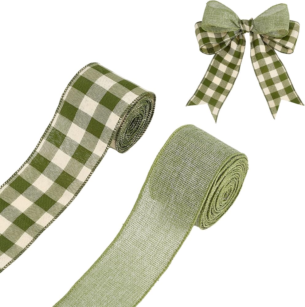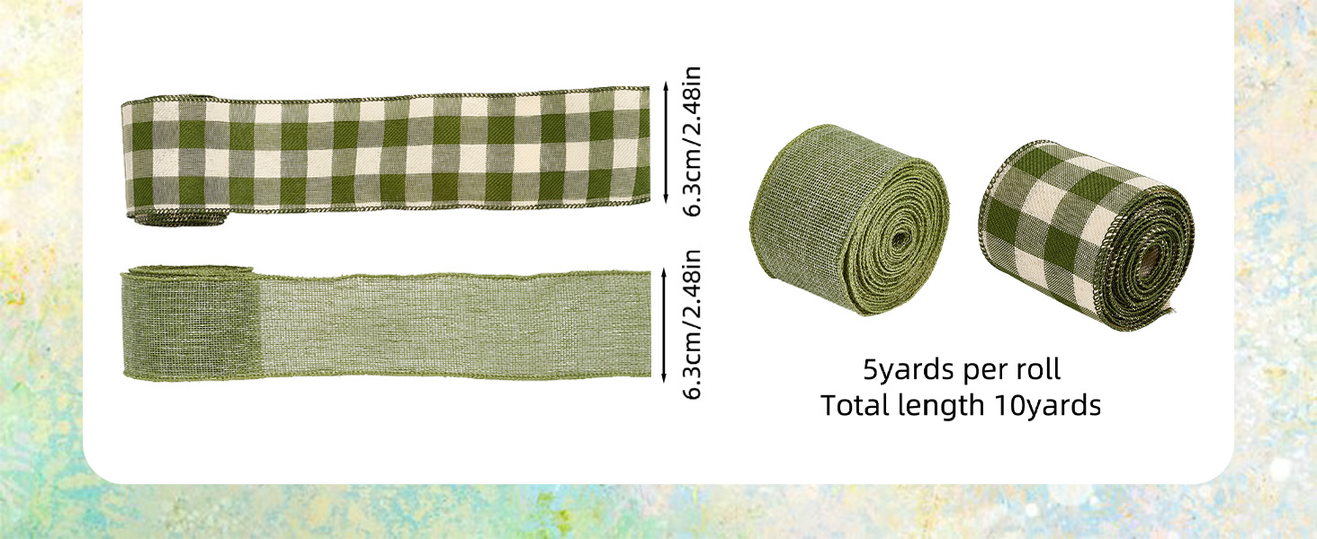 • لفتان من أشرطة الخيش السلكية: سوف تحصل على لفتين من الشريط المنقوش، واحدة بنمط منقوش الجاموس مع مربعات خضراء وبيضاء، والأخرى بلون أخضر حكيم صلب، مثالية للمزج والمطابقة لجميع أنواع ديكورات العطلات