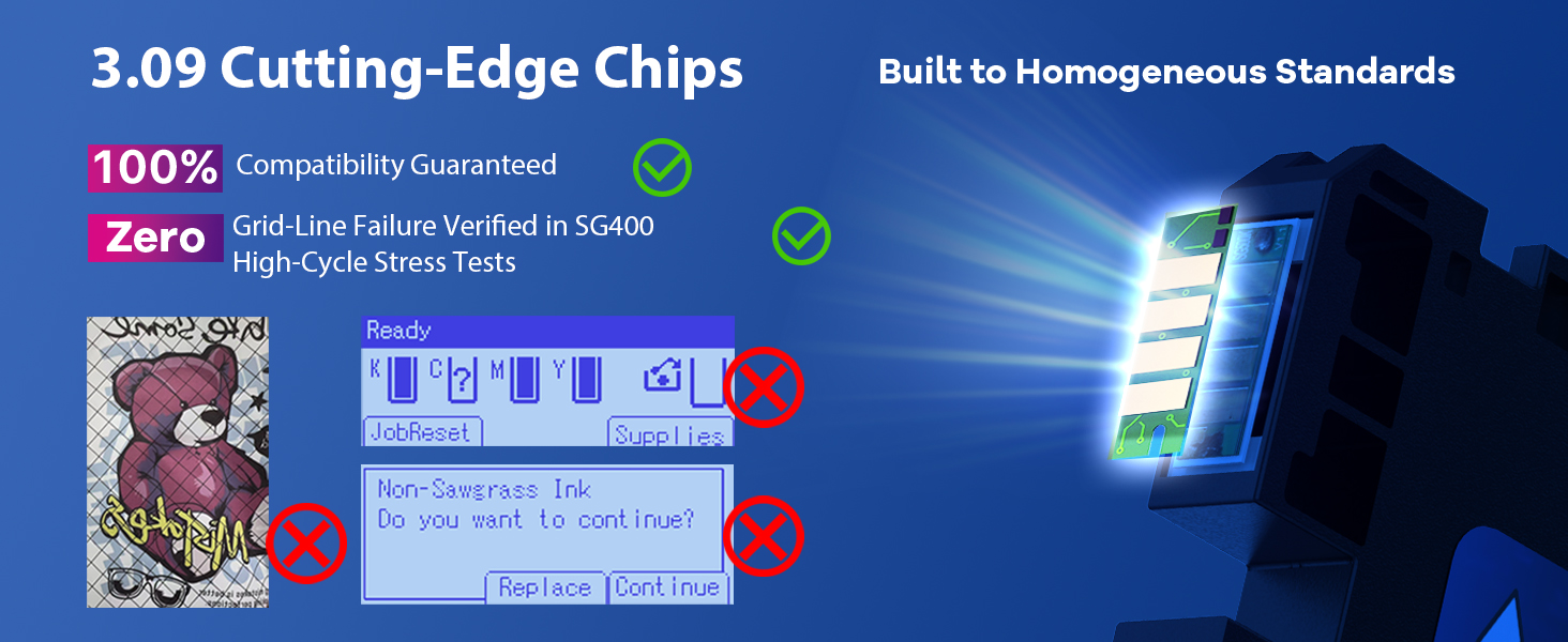 خرطوشة حبر التسامي 2026 3.09 متوافقة مع طابعة Sawgrass SG400 SG800 جميع الإصدارات | لا توجد خطوط شبكة مضمونة | يدوم طويلاً | حبر جل عالي الأداء وعالي اللزوجة (4 قطع، B/C/M/Y)