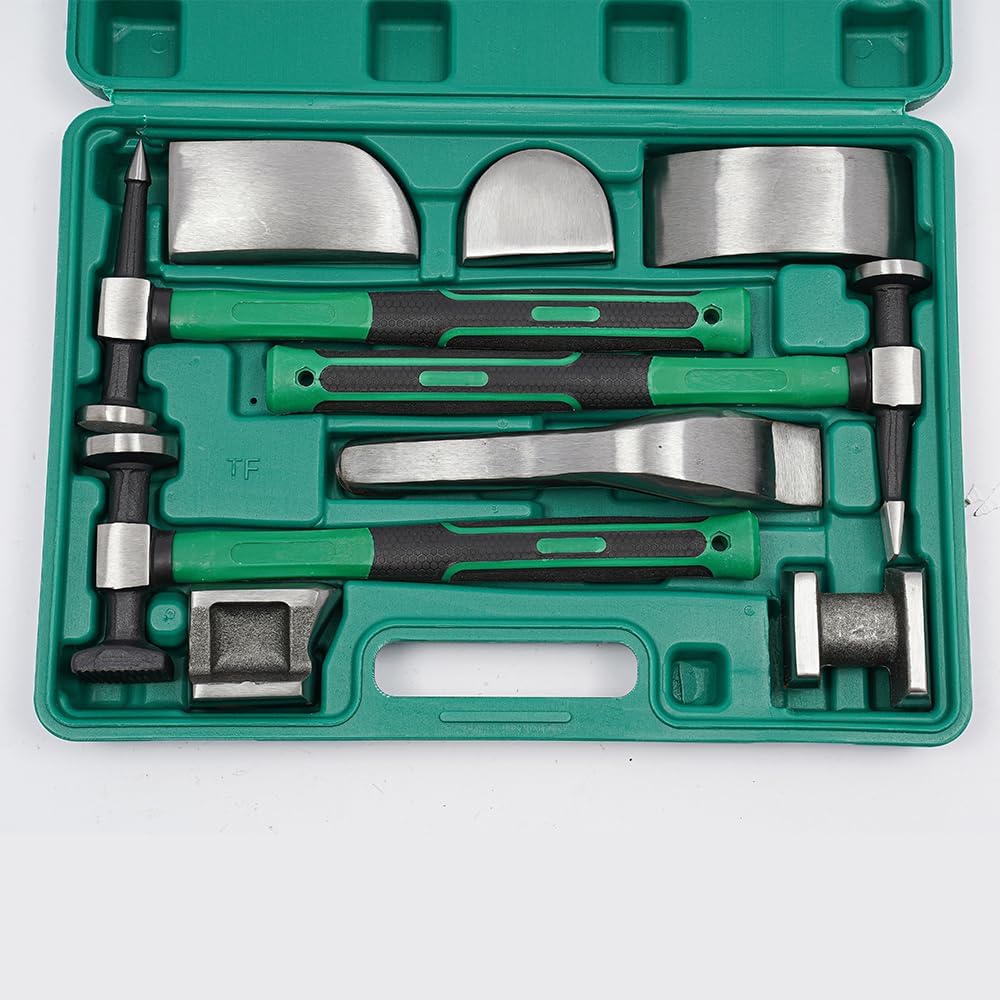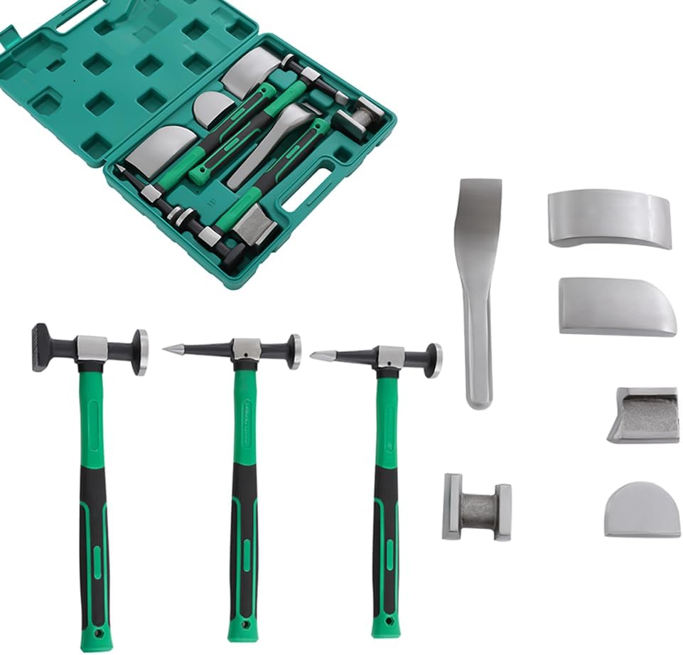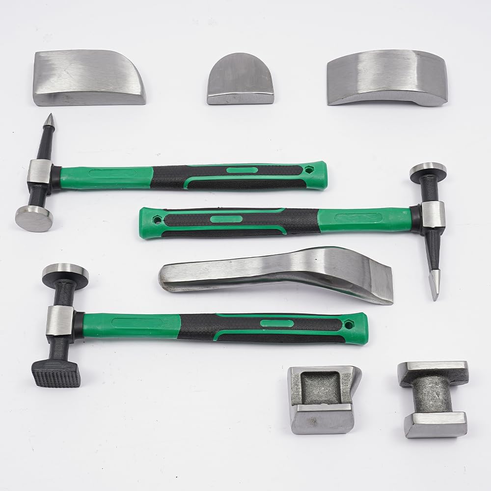 • 【𝟵𝗽𝗰𝘀 𝗖𝗼𝗺𝗽𝗹𝗲𝘁𝗲 𝗔𝘂𝘁𝗼 𝗥𝗲𝗽𝗮𝗶𝗿 𝗦𝗲𝘁】You get 3 specialized hammers (bumping, pick-and-finish, reverse-curve) and 6 versatile dollies. Perfect tool for every contour and curve.