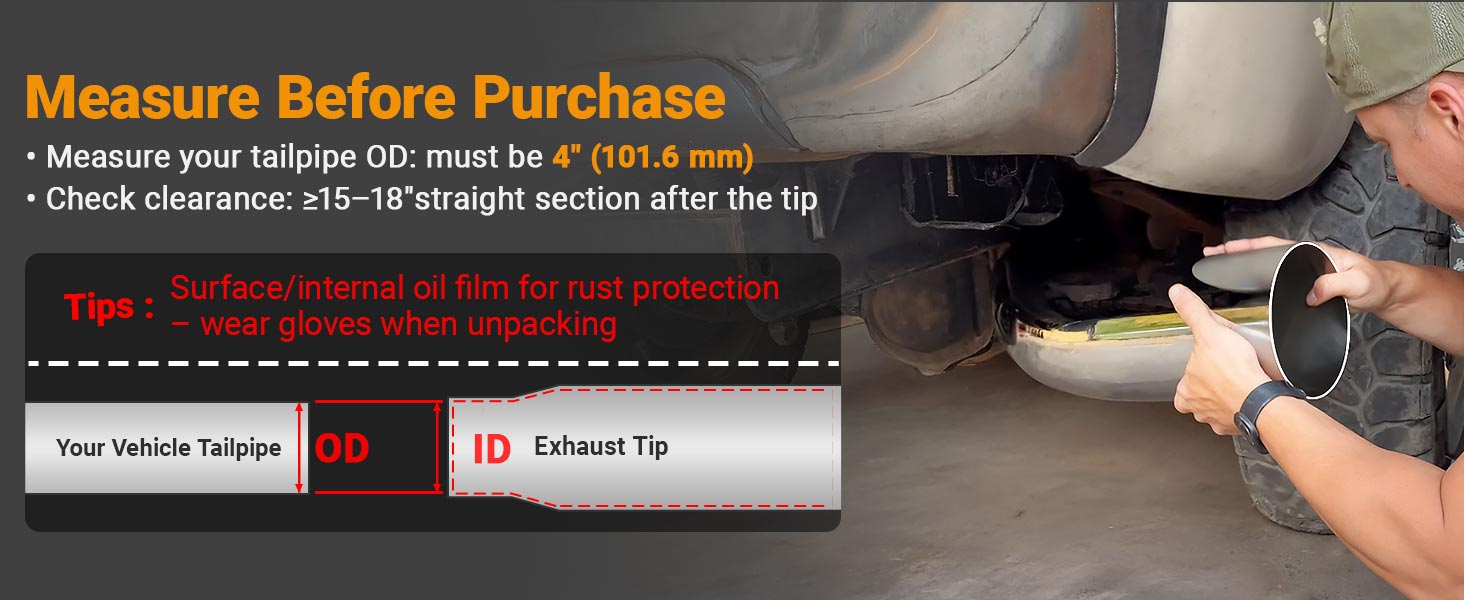 مدخل عالمي مقاس 4 بوصات مناسب لشاحنات الديزل والغاز - تم تصميمه بمدخل مقاس 4 بوصات ومخرج مقاس 6 بوصات، ويتوافق طرف مرفق العادم هذا مع معظم الالتقاطات والشاحنات والسيارات ذات أنبوب عادم OD مقاس 4 بوصات. (القياس قبل الشراء: يجب أن يكون القطر الخارجي لأنبوب العادم 4 بوصات / 101.6 ملم، ويضمن خلوصًا مستقيمًا يبلغ ≥15-18 بوصة بعد الطرف.) ترقية رائعة لمحركات الديزل التي توجد عادةً في شاحنات البيك أب عالية التحمل، مما يوفر أسلوبًا وصوتًا جريئين.