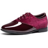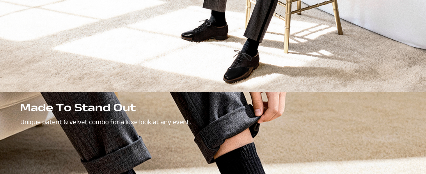 Smart Look: Crafted with a patent-spliced velvet upper, these boys' dress shoes add a standout, sophisticated touch to his look for any occasion.