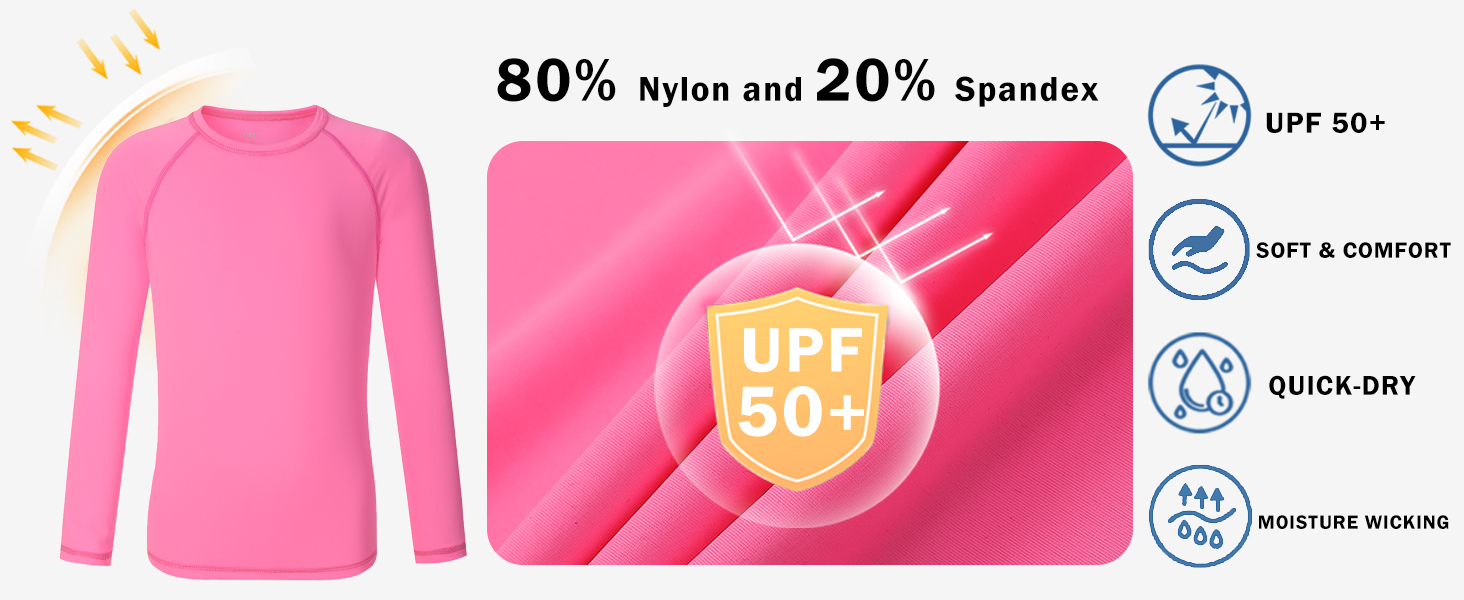 قمصان حماية من الشمس للأطفال بعامل حماية من أشعة الشمس 50+ مصنوعة من مزيج من النايلون والألياف اللدنة عالي الجودة، يمكن أن تجعل حرفة الحماية من الطفح الجلدي القمصان تلبس لبضع سنوات