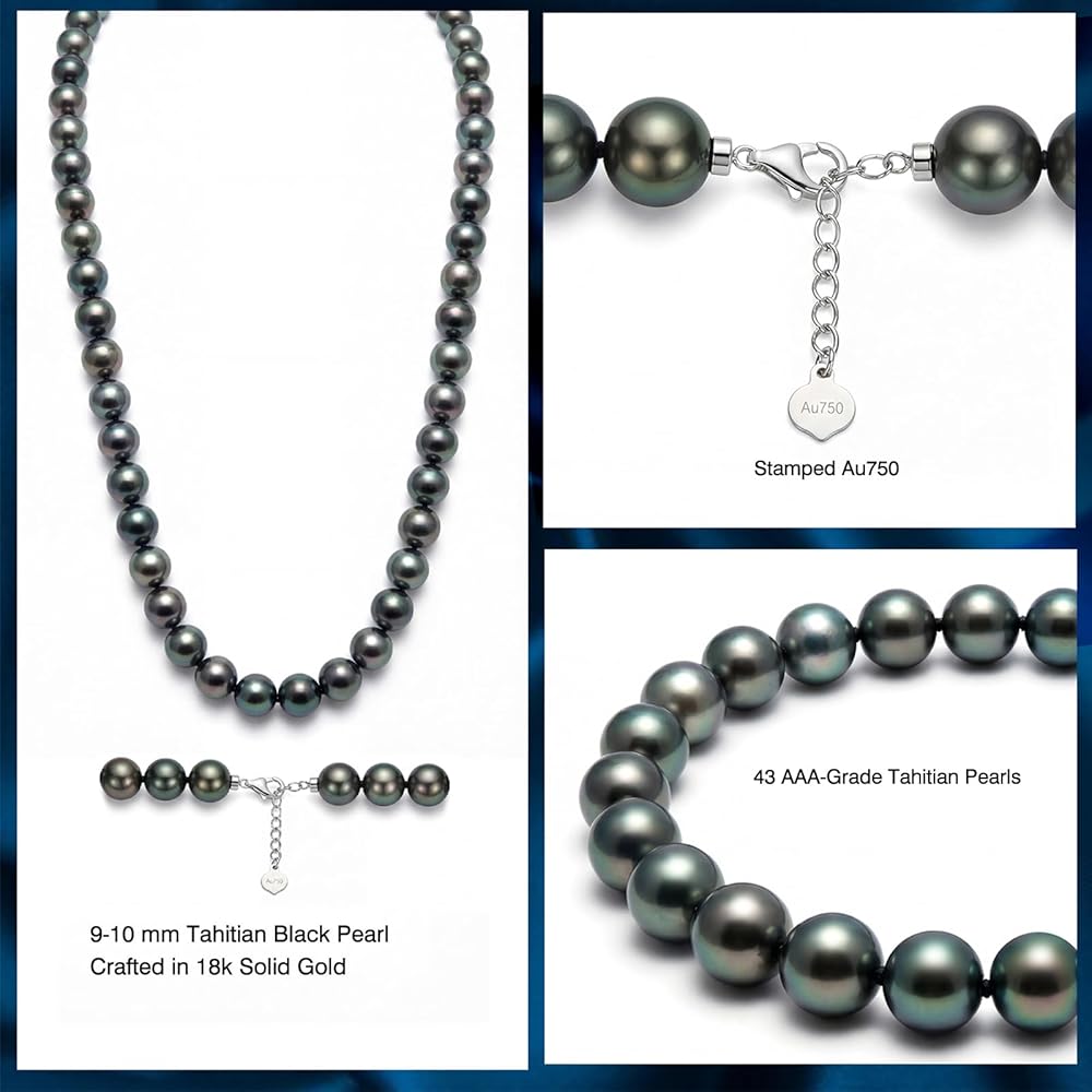 قلادات من الذهب الصلب عيار 18 قيراطًا من اللؤلؤ الأسود التاهيتي الحقيقي للنساء - 43 قطعة 9-10 مم AAA من اللؤلؤ المزروع في المحيط، قلادات حبلا، هدايا فاخرة لذكرى الزفاف وأعياد الميلاد للزوجة والأم، الطول 17.7 بوصة + 2 بوصة