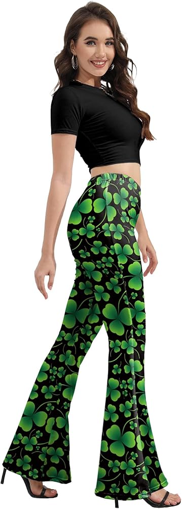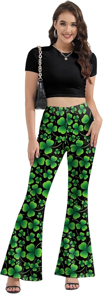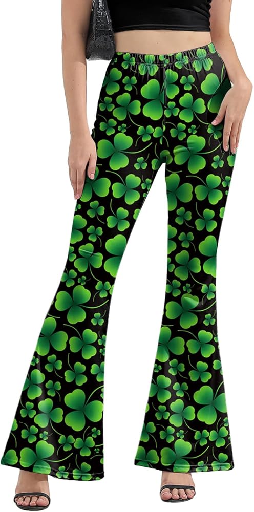 [Meet St. Patrick's Day Luck] - Stand out at St. Patrick's Day parades and parties with our womens st patricks day pants! These retro-inspired bell bottom leggings for women blend flair with festive charm, featuring bold shamrock clover prints that pop against rich green fabric. The high-waisted design hugs your curves while the flared legs create a leg-lengthening silhouette—perfect for channeling disco energy at your next Irish celebration!