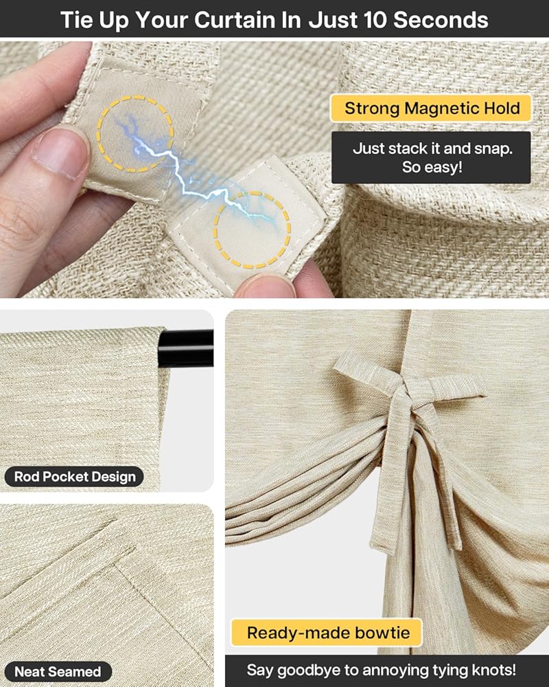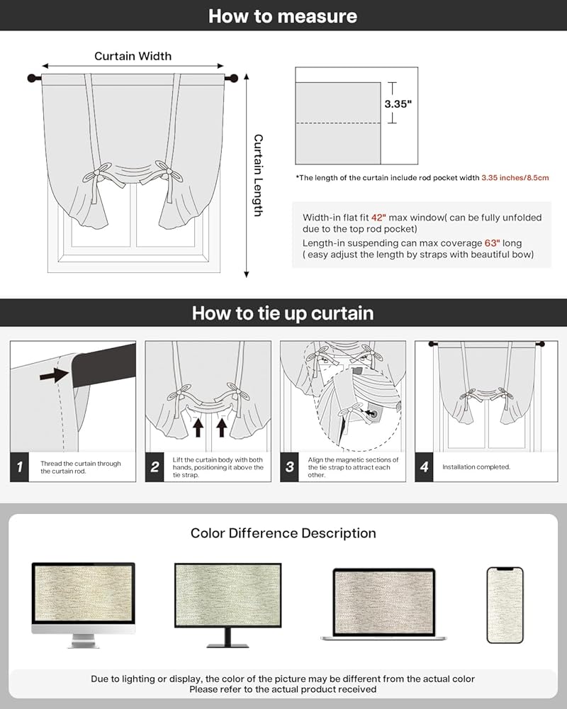 تتضمن الحزمة: تباع كلوحة واحدة. تحتوي العبوة على قطعة واحدة من الستارة المربوطة. مقاسات المقاس: 31 بوصة عرض × 47 بوصة طول. مصنوع من جيب قضيب مقاس 4 بوصات يناسب مختلف قضبان الستائر القياسية أو المزخرفة.