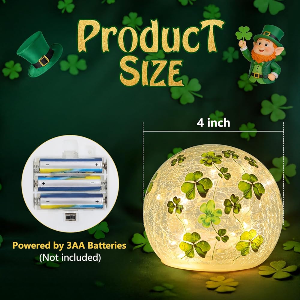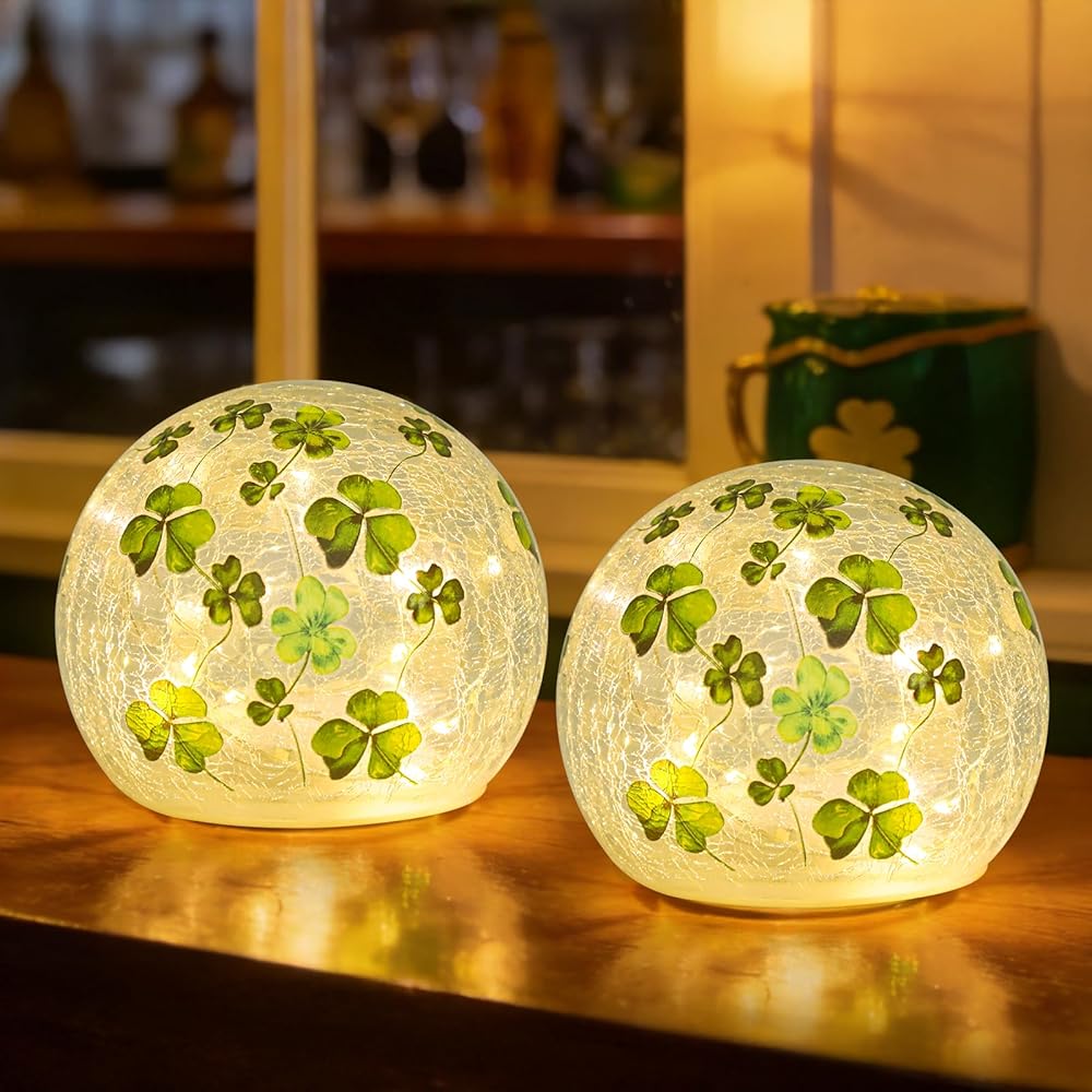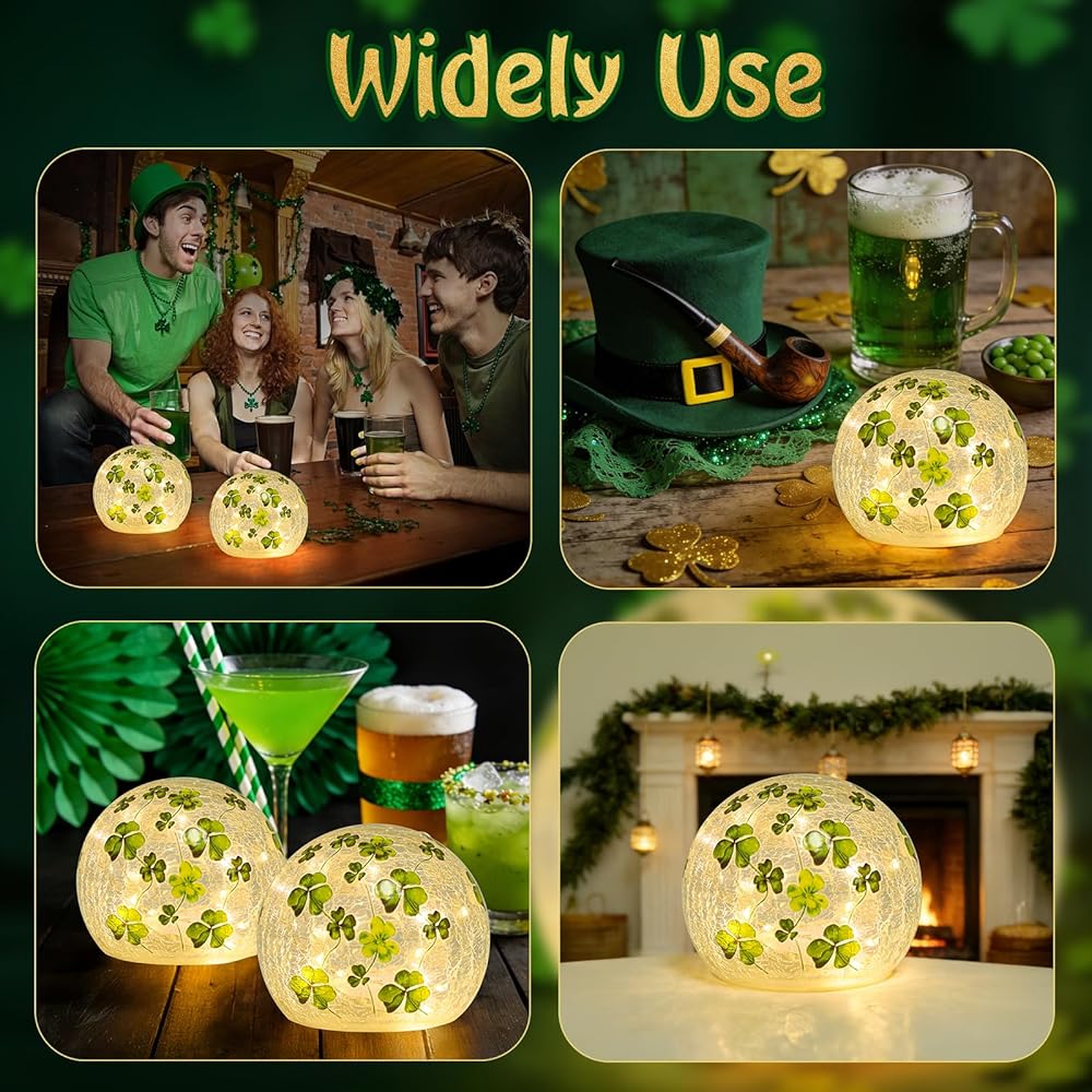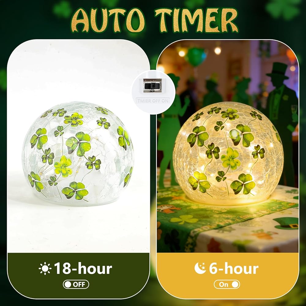 زينة عيد القديس باتريك، مجموعة من 2 مصباح كروي زجاجي مضيء مع مؤقت، أضواء ليلية على شكل كرة البرسيم الأخضر للمنزل قطع مركزية للطاولة الداخلية، رف، ديكور الحفلات الاحتفالية