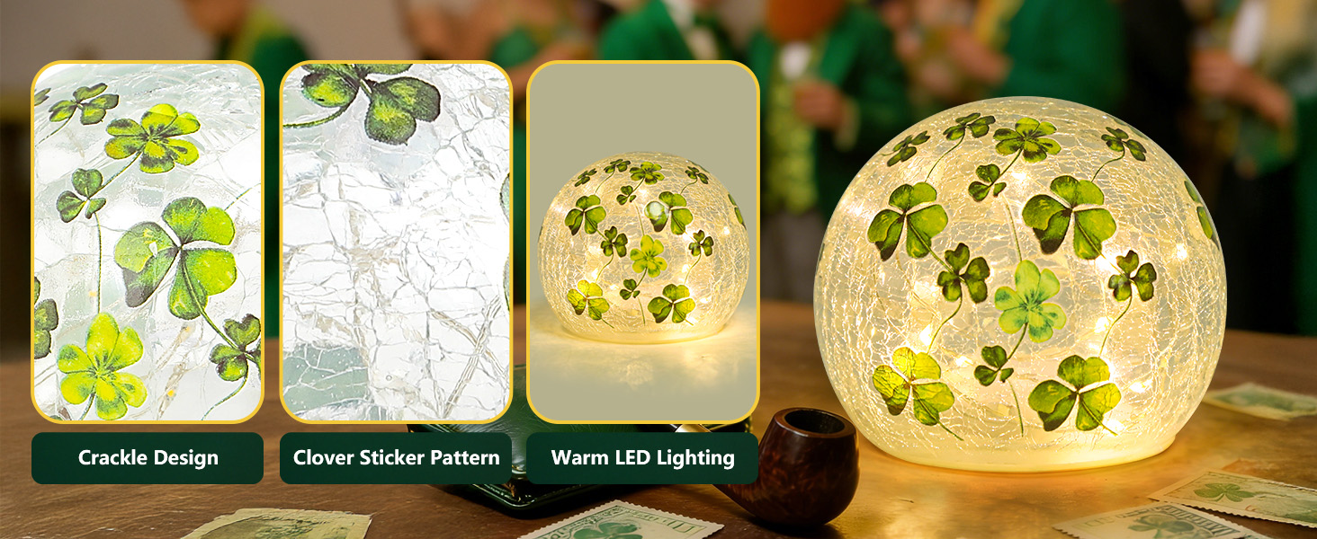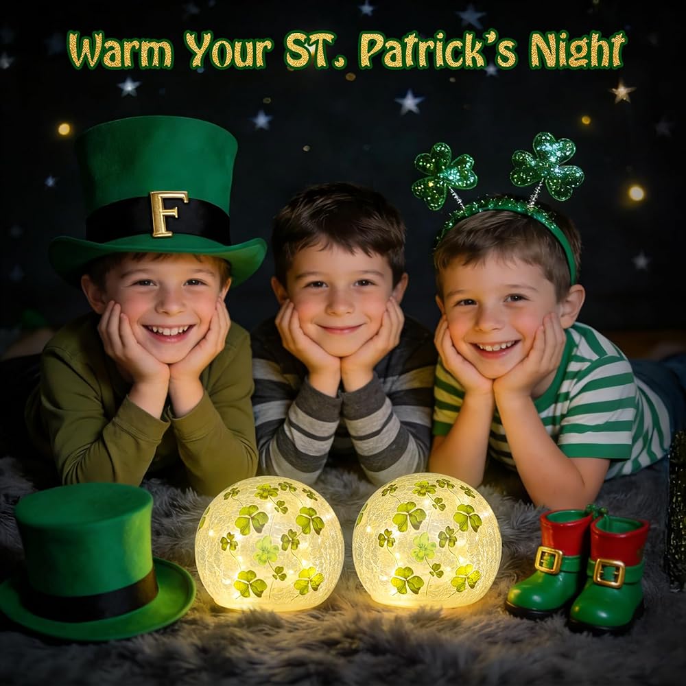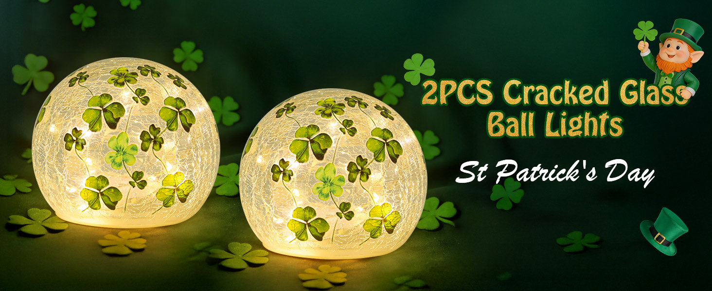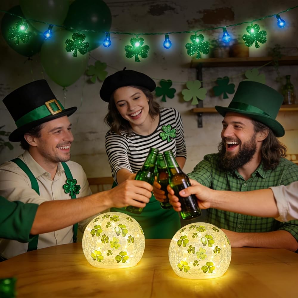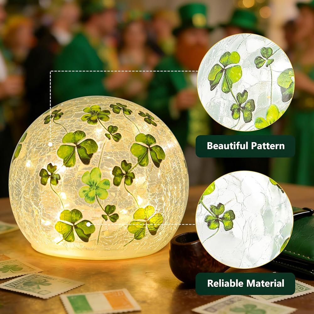 زينة عيد القديس باتريك، مجموعة من 2 مصباح كروي زجاجي مضيء مع مؤقت، أضواء ليلية على شكل كرة البرسيم الأخضر للمنزل قطع مركزية للطاولة الداخلية، رف، ديكور الحفلات الاحتفالية