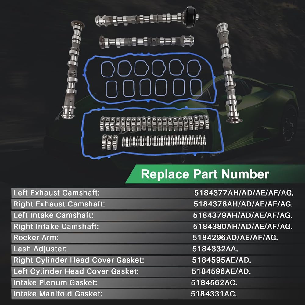 Left Exhaust Camshaft: 5184377AH/AD/AE/AF/AG Right Exhaust Camshaft: 5184378AH/AD/AE/AF/AG Left Intake Camshaft: 5184379AH/AD/AE/AF/AG Right Intake Camshaft: 5184380AH/AD/AE/AF/AG *** Rocker Arm: 5184296AD/AE/AF/AG Lash Adjuster: 5184332AA Right Cylinder Head Cover Gasket: 5184595AE/AD Left Cylinder Head Cover Gasket: 5184596AE/AD Intake Plenum Gasket: 5184562AC Intake Manifold Gasket: 5184331AC