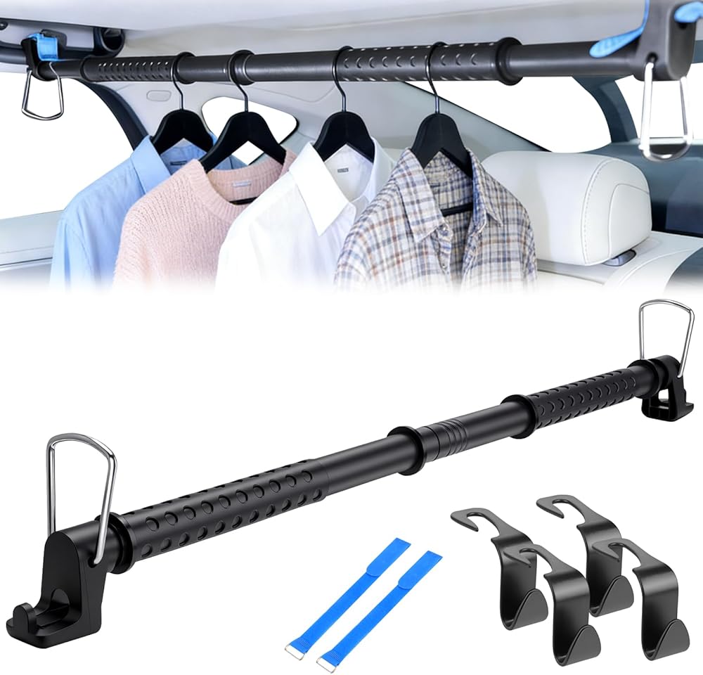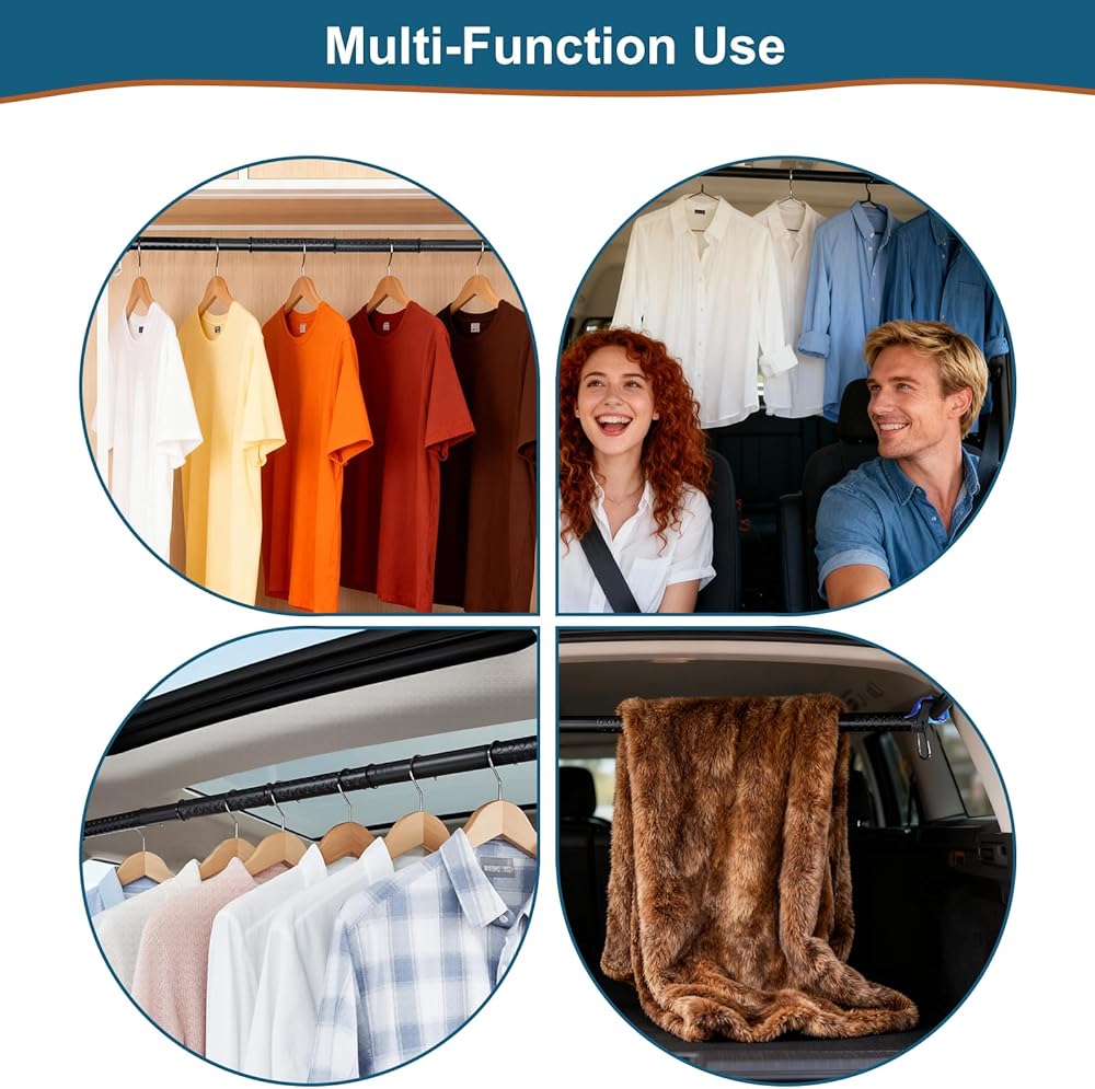 شريط شماعات ملابس السيارة 28-61 بوصة، قضيب ملابس شديد التحمل للسيارة، شريط تعليق ملابس خالي من التجاعيد، رف ملابس قابل للتعديل لسيارات الدفع الرباعي والشاحنات والشاحنات والشاحنات، مع 4 قطع خطافات مقعد إضافية