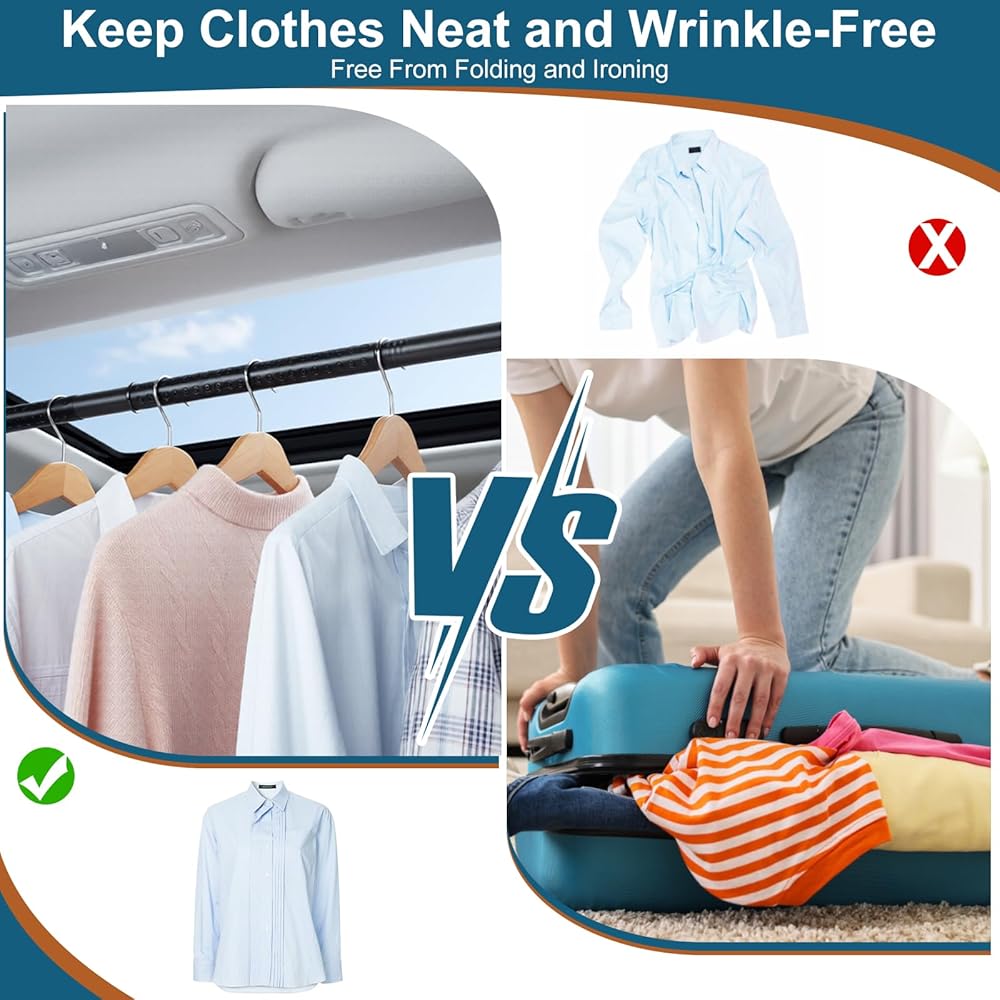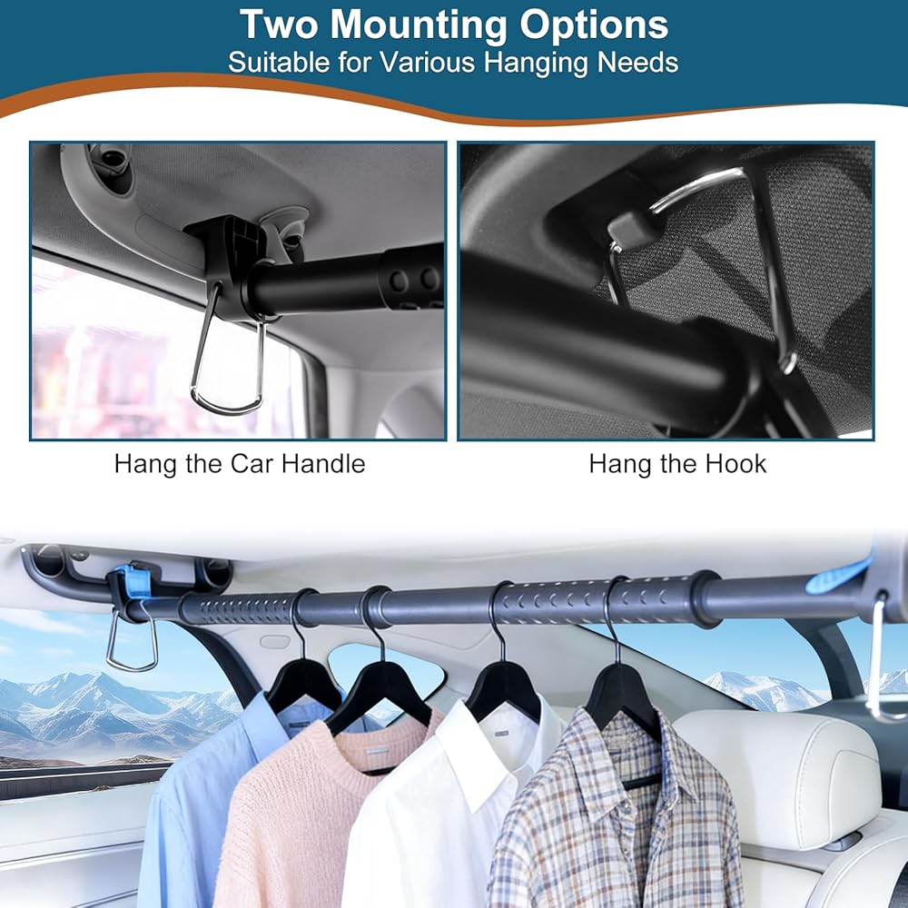 • 【تركيب سريع بدون أدوات】شريط تعليق الملابس هذا للسيارة، يتم تركيبه دون الحاجة إلى أدوات، فقط قم بتجميعه يدويًا، واضبط القضيب على الطول المثالي الخاص بك وعلقه بأمان. يتميز بخيارين للتركيب، يمكن تثبيته بسهولة على مقابض الإمساك الخلفية لسيارتك أو خطافات المعطف لتناسب أنواع المركبات المختلفة