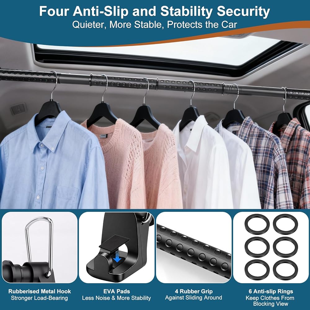 • 【تصميم ثبات مانع للانزلاق】يحتوي قضيب ملابس السيارة هذا على وسادتين من مادة EVA، وشريطين لاصقين فيلكرو لقفل القضيب بإحكام، ويمنع الانزلاق على الطرق الوعرة أو المنعطفات الحادة. كما أنها تحتوي على سطح غير لامع غير قابل للانزلاق و6 حلقات مضادة للانزلاق قابلة للإزالة وقابلة للتعديل، وتفصل السترات والسراويل والقمصان بشكل أنيق في الرحلات ويمكن استخدامها كقواطع للملابس المنزلية.