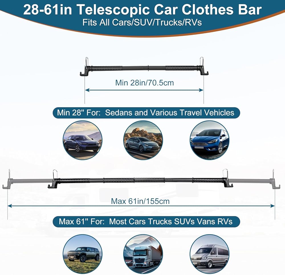 • 【شماعة ملابس السيارة تلسكوبية】يتميز شريط شماعة ملابس السيارة Bvomheez بتصميم من ثلاثة أقسام مع قضبان تلسكوبية مزدوجة الجوانب، وطول قابل للتعديل من 28 بوصة إلى 61 بوصة. قم بقياس المسافة بين مقبض الإمساك بسيارتك أولاً للحصول على ملاءمة مثالية، مما يجعلها مثالية لمختلف المركبات بما في ذلك السيارات وRVs وسيارات الدفع الرباعي والشاحنات