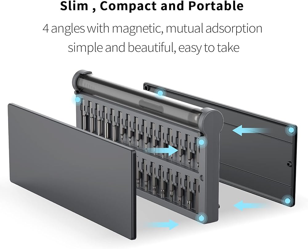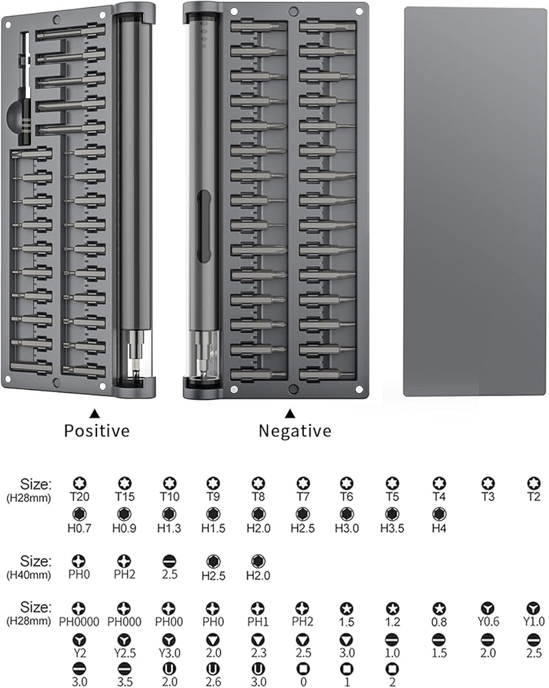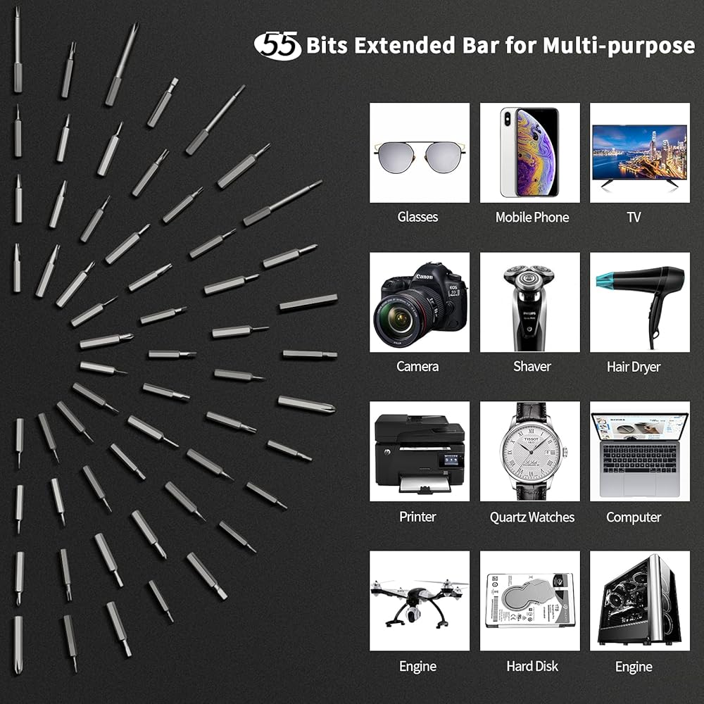 【استخدامات متعددة الأغراض】تأتي مع 55 لقمة دقيقة وقضيب ممتد، يمكن أن تلبي رؤوس مفك البراغي المختلفة بمواصفات مختلفة الاحتياجات المختلفة بسهولة. مناسب لساعة الكوارتز والأجهزة المنزلية العادية مثل الكاميرات الرقمية وأجهزة الراديو والتابلت والكمبيوتر والهواتف الذكية والطائرات بدون طيار وعصا التحكم وبعض المنتجات الإلكترونية وما إلى ذلك.