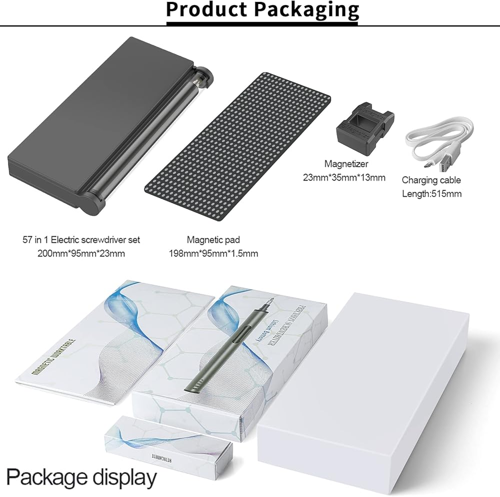 【محتويات العبوة】1 مفك براغي كهربائي صغير؛ 55 لقمة دقيقة؛ 1 قضيب تمديد، 1 ممغنط، 1 وسادة مغناطيسية، 1 كابل شحن USB؛ حقيبة تخزين؛ ضمان استرداد الأموال لمدة 30 يومًا وضمان لمدة 12 شهرًا. إذا كانت لديك أي مشكلة، فلا تتردد في الاتصال بنا في المرة الأولى. سنحل هذه المشكلة لك دون أي تردد. إنها هدية مناسبة جدًا لعيد الميلاد / عيد الشكر / الكريسماس / عيد الحب للعائلات والأصدقاء.