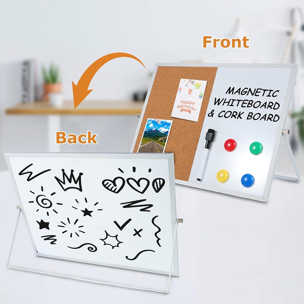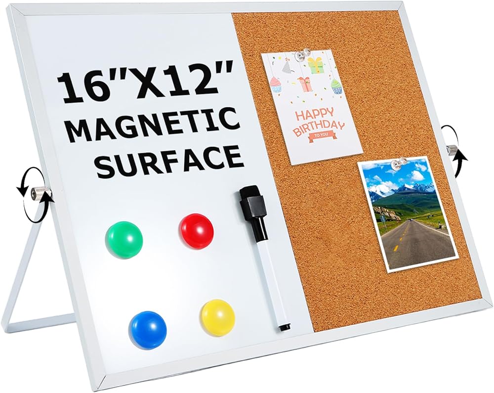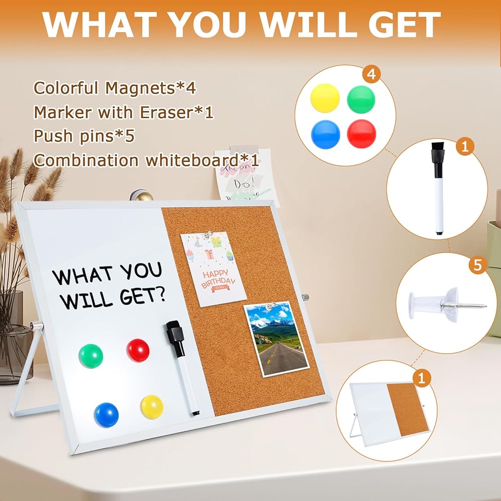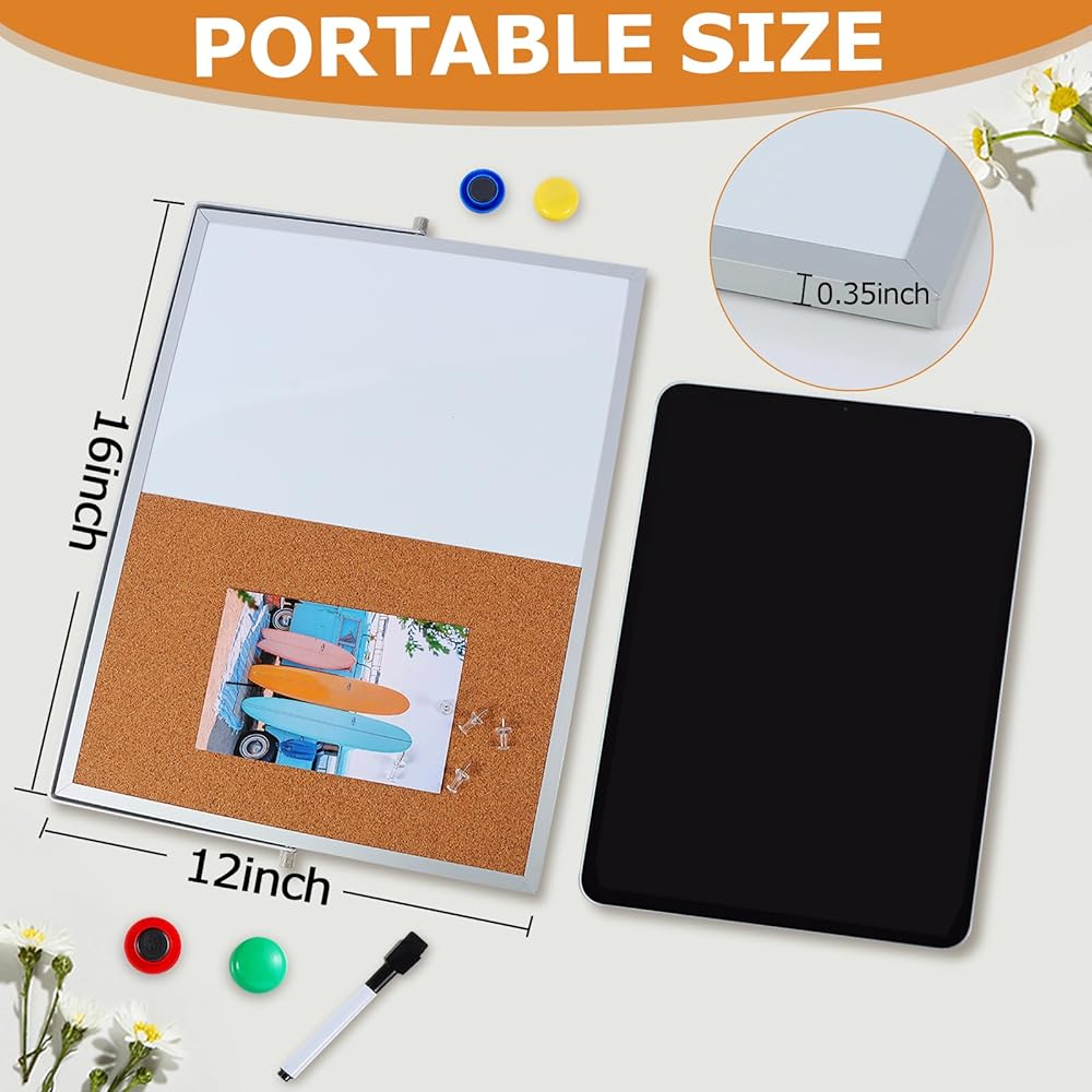Whiteboard and Corkboard Combo Elevate your organization with our 2-in-1 Whiteboard and Corkboard Combo! This versatile set includes a 16" x 12" corkboard and a dry erase whiteboard, perfect for any workspace. It comes with 5 push pins, 4 colorful magnets, and a whiteboard marker with an eraser for your convenience. Featuring a double-sided design, one side showcases eco-friendly engineered wood and high-quality cork, while the reverse side features a smooth white surface made of engineered wood and white iron. The sleek aluminum frame adds a touch of elegance. Enjoy effortless switching between tasks with the 360° rotating button, allowing seamless transition between different usage scenarios. Ideal for offices, schools, and home education, this board can be easily mounted on the wall for use as a message board. The whiteboard is perfect for to-do lists, reminders, and creative doodling, while the corkboard is great for displaying photos, documents, badges, and postcards.
