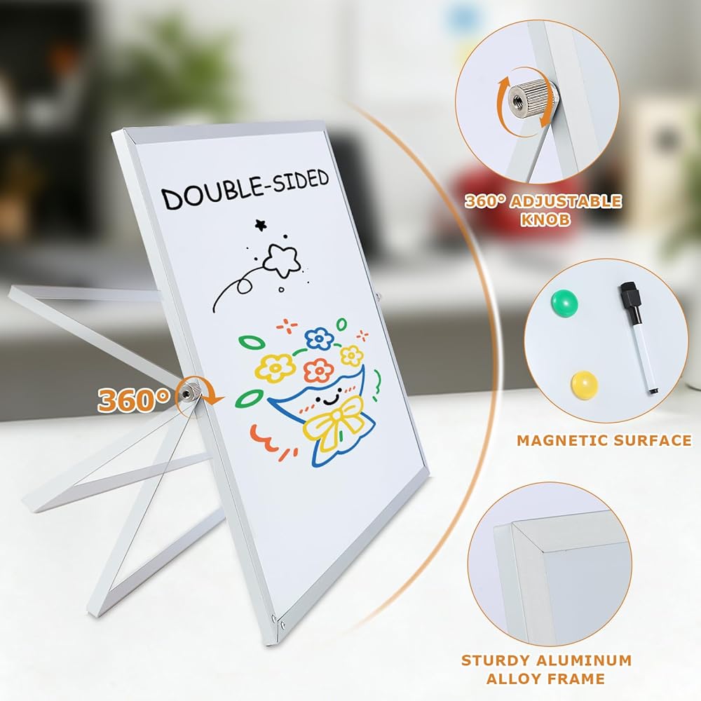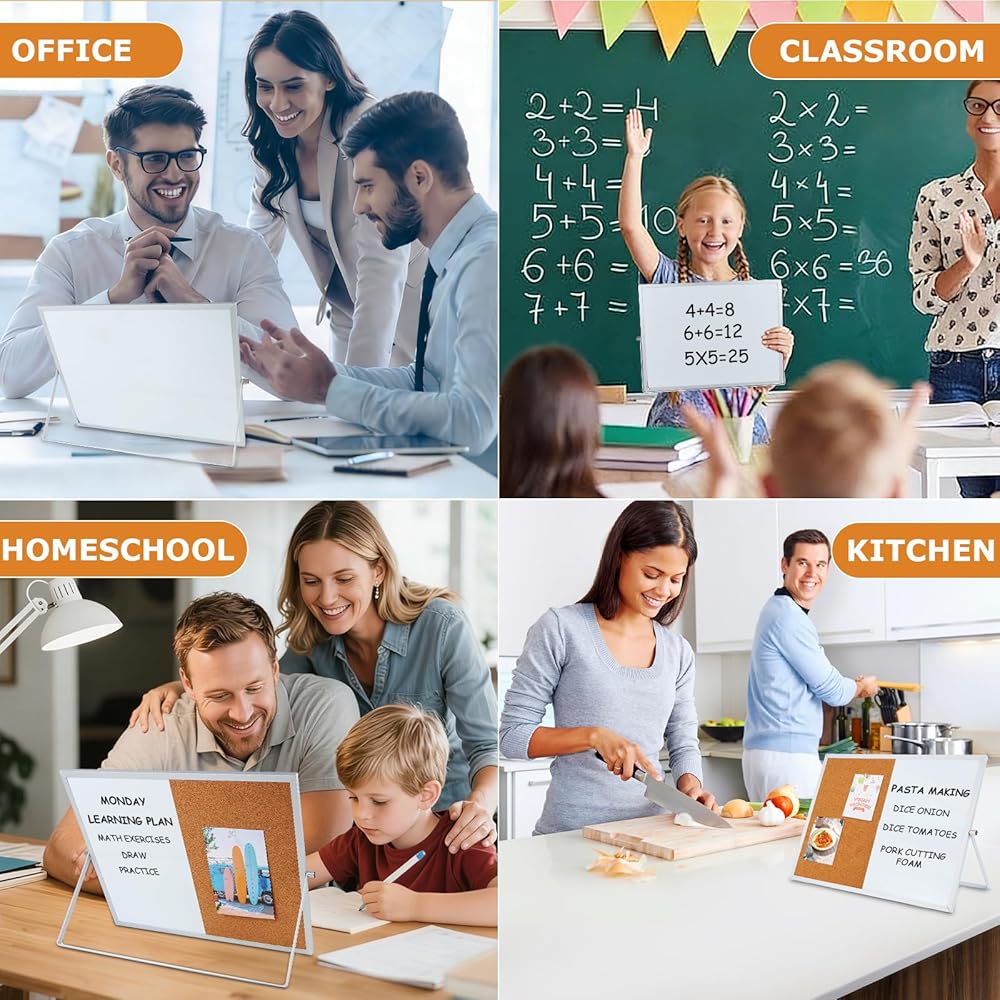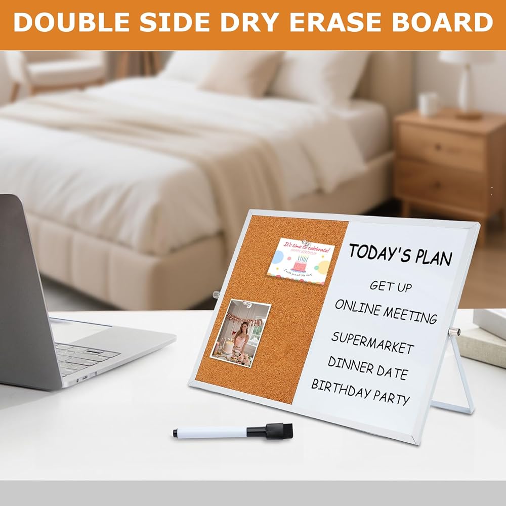 Whiteboard and Corkboard Combo Elevate your organization with our 2-in-1 Whiteboard and Corkboard Combo! This versatile set includes a 16" x 12" corkboard and a dry erase whiteboard, perfect for any workspace. It comes with 5 push pins, 4 colorful magnets, and a whiteboard marker with an eraser for your convenience. Featuring a double-sided design, one side showcases eco-friendly engineered wood and high-quality cork, while the reverse side features a smooth white surface made of engineered wood and white iron. The sleek aluminum frame adds a touch of elegance. Enjoy effortless switching between tasks with the 360° rotating button, allowing seamless transition between different usage scenarios. Ideal for offices, schools, and home education, this board can be easily mounted on the wall for use as a message board. The whiteboard is perfect for to-do lists, reminders, and creative doodling, while the corkboard is great for displaying photos, documents, badges, and postcards.