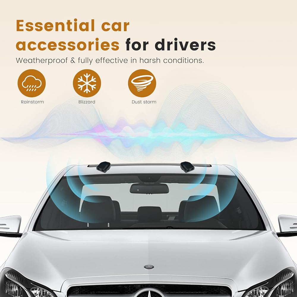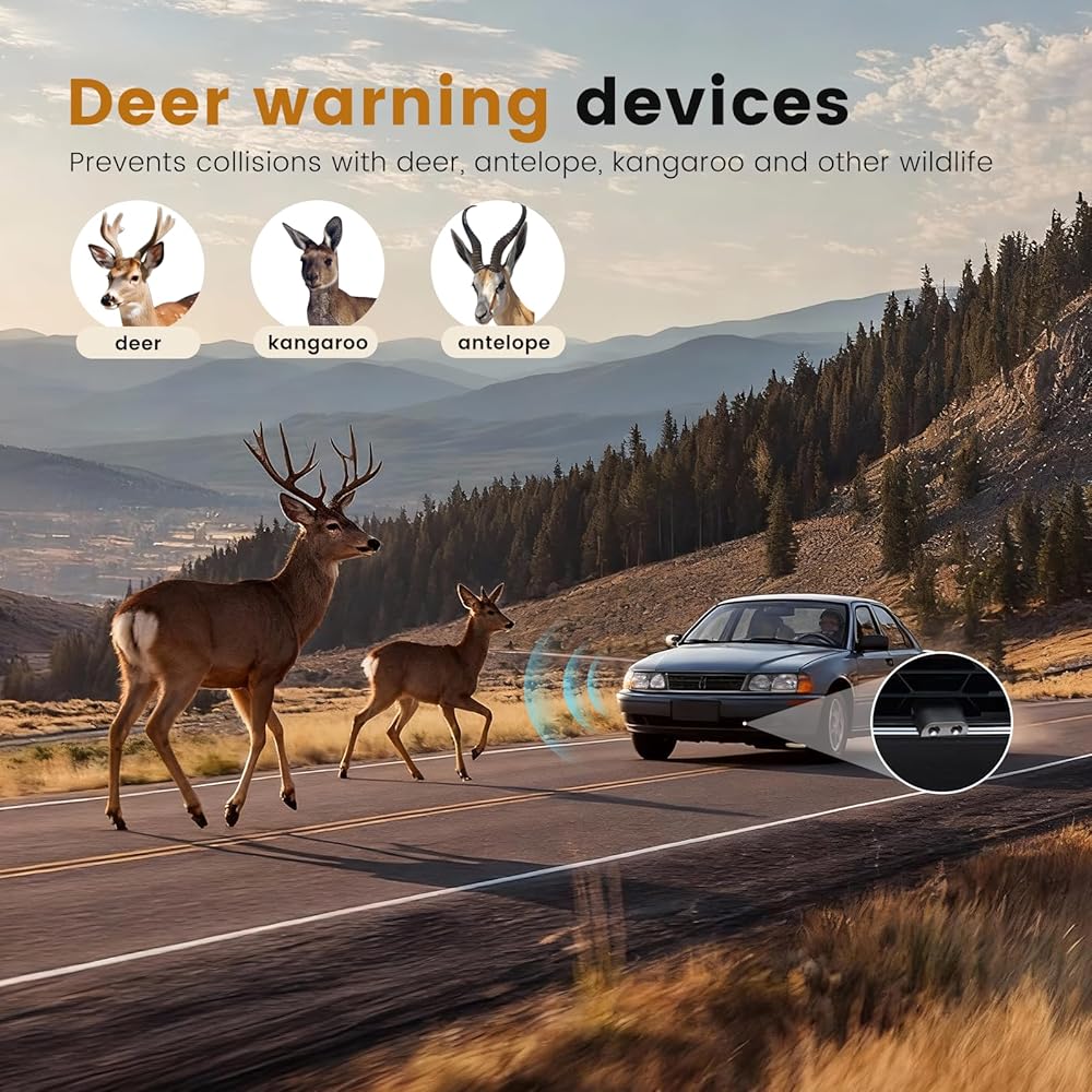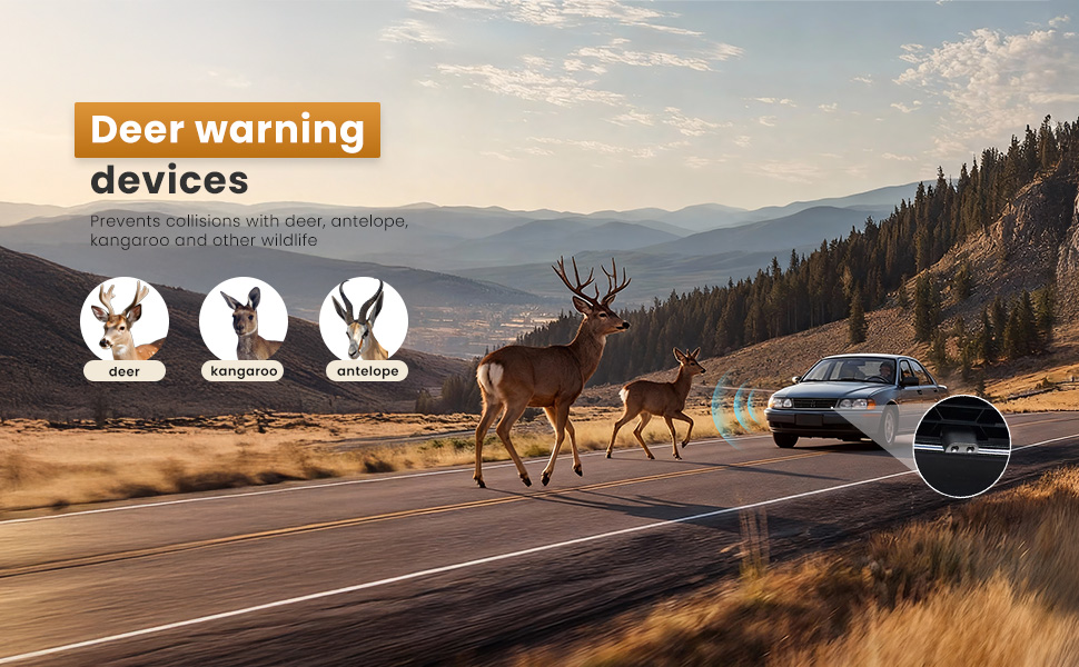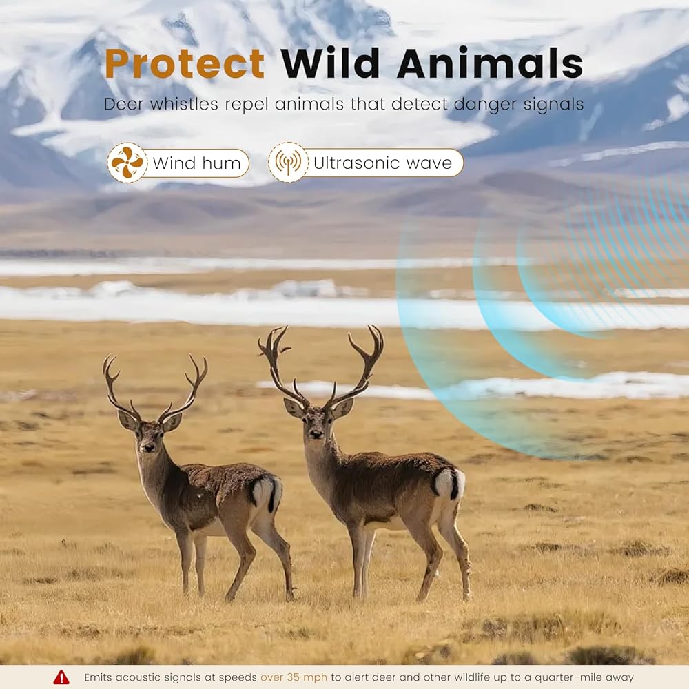 جهاز أمان يعمل بالرياح: يتم تفعيل صفارات تحذير الغزلان تلقائيًا بسرعات تزيد عن 35 ميلاً في الساعة، وتصدر أصوات بالموجات فوق الصوتية لتنبيه الغزلان والأيائل والظباء والكنغر من مسافة تصل إلى ربع ميل لمنع اصطدام الحيوانات بسيارتك.
