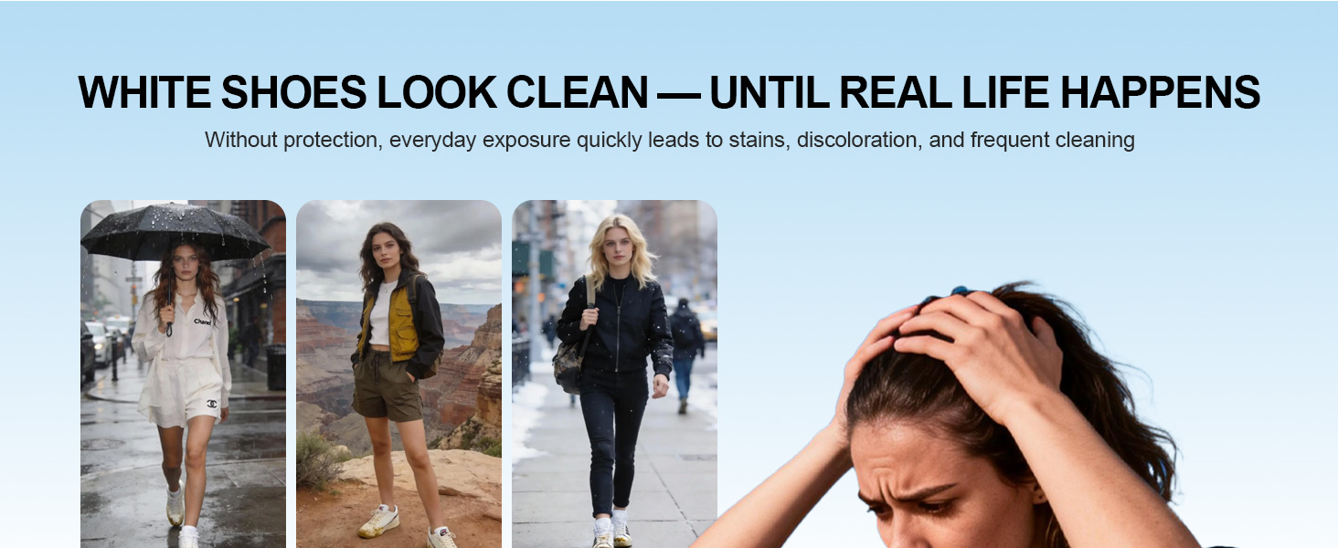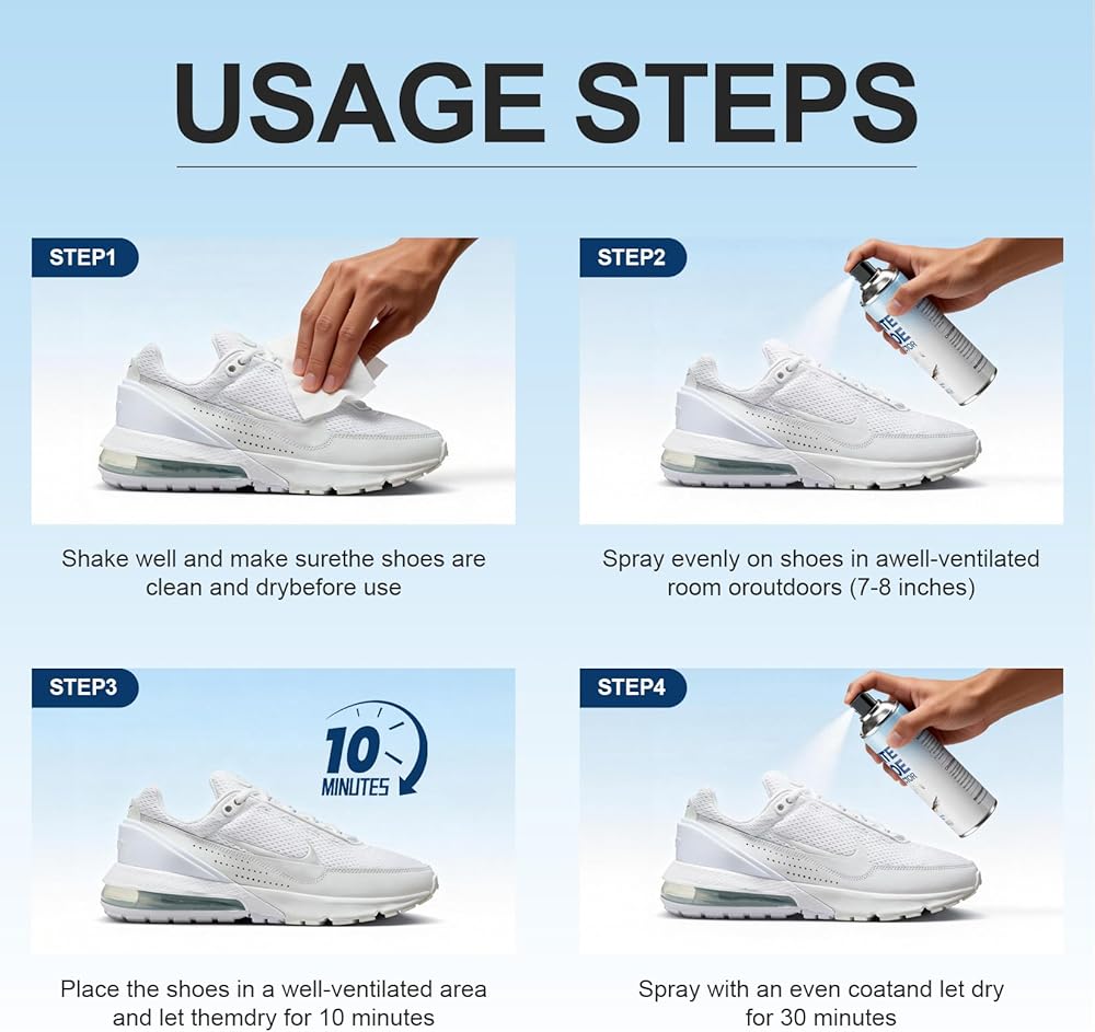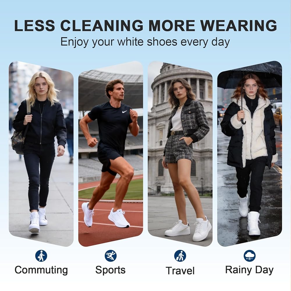• تجفيف سريع للارتداء اليومي - يجف خلال 10 دقائق ويمكن تنظيفه بسهولة بعد الاستخدام. مناسب للأحذية الرياضية البيضاء والأحذية الجلدية والقماشية، ويوفر حماية ثابتة للارتداء اليومي دون تغيير الملمس أو المظهر الأصلي.