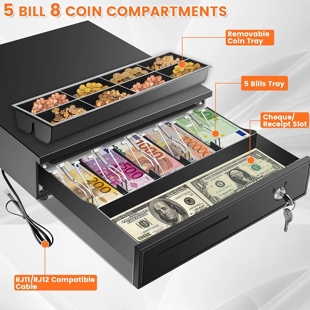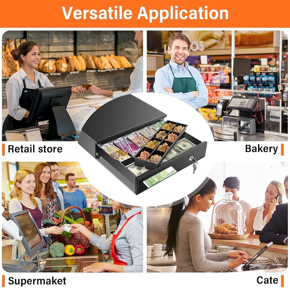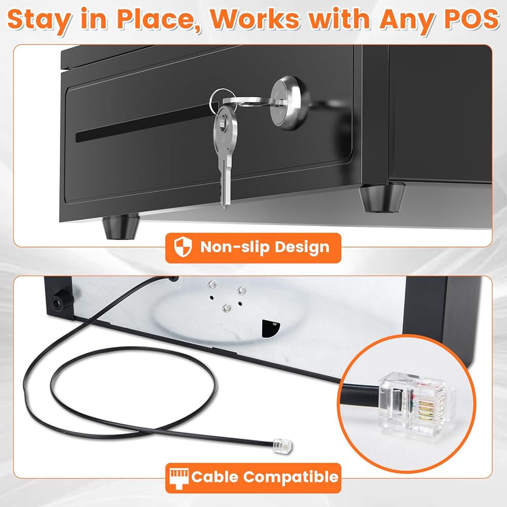 【الاتصال والتوافق】يتصل درج النقود الخاص بنا بسهولة بطابعة الإيصالات الخاصة بك باستخدام كابل RJ11/RJ12 المتضمن. بمجرد الاتصال، فإنه يفتح ويغلق بسلاسة مع معاملات نقاط البيع الخاصة بك. وهو متوافق مع معظم العلامات التجارية الرئيسية للطابعات الحرارية والإيصالات، بما في ذلك Star وCitizen وJAY وBixolon. (ملاحظة: لا يحتوي درج النقود هذا على منفذ USB ولا يمكن توصيله مباشرة بنظام نقطة البيع عبر USB.)
