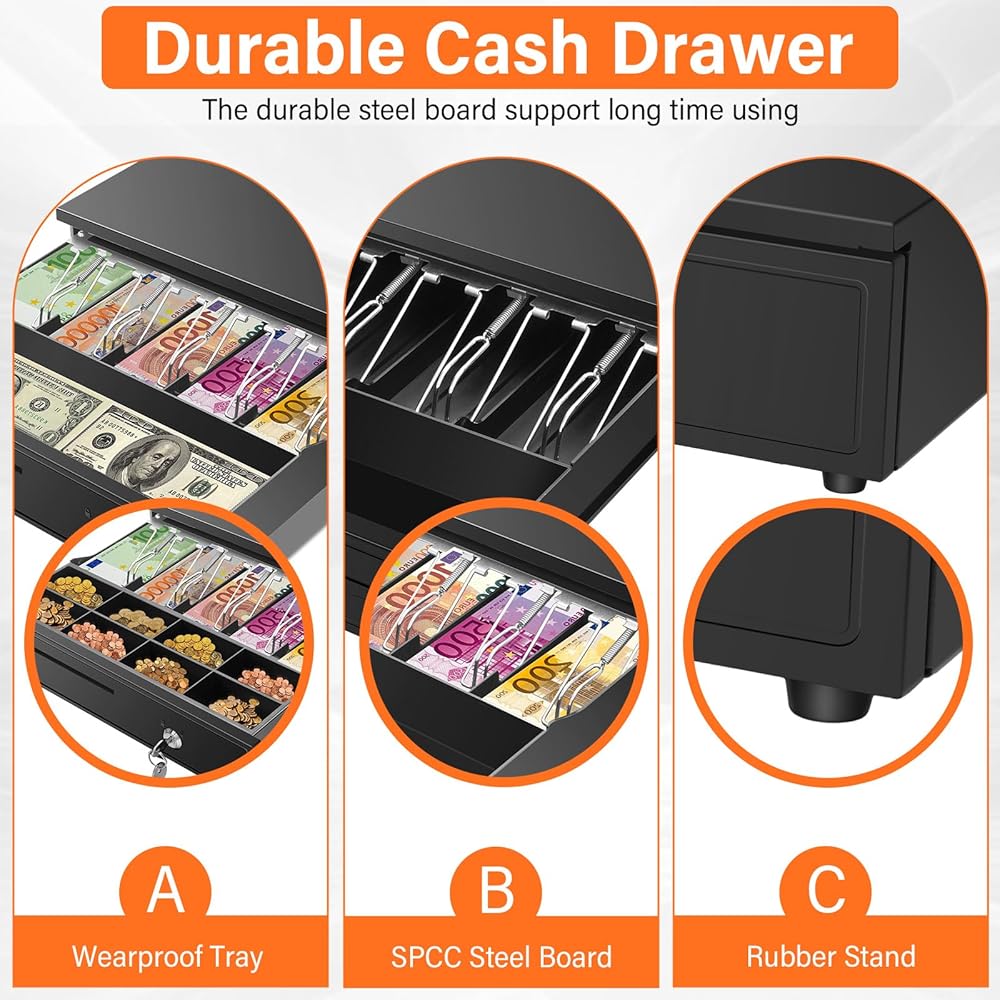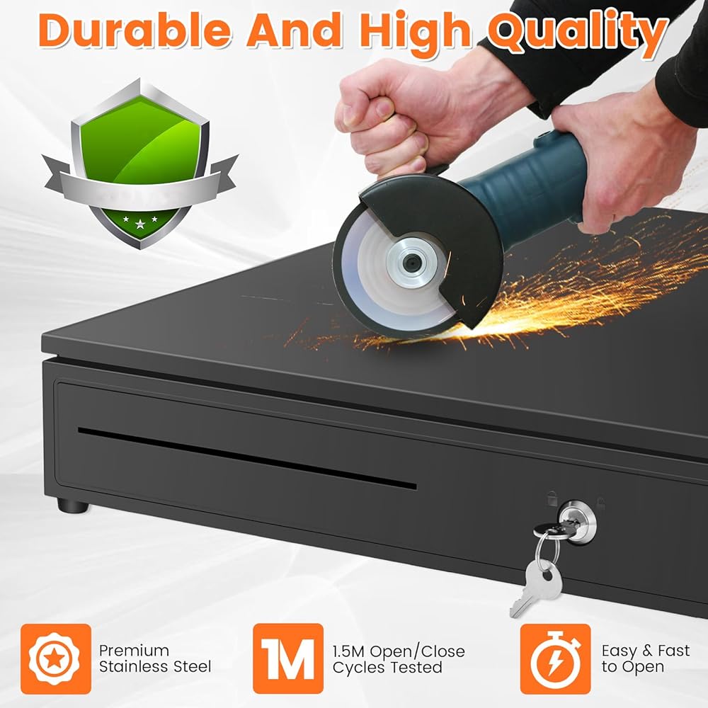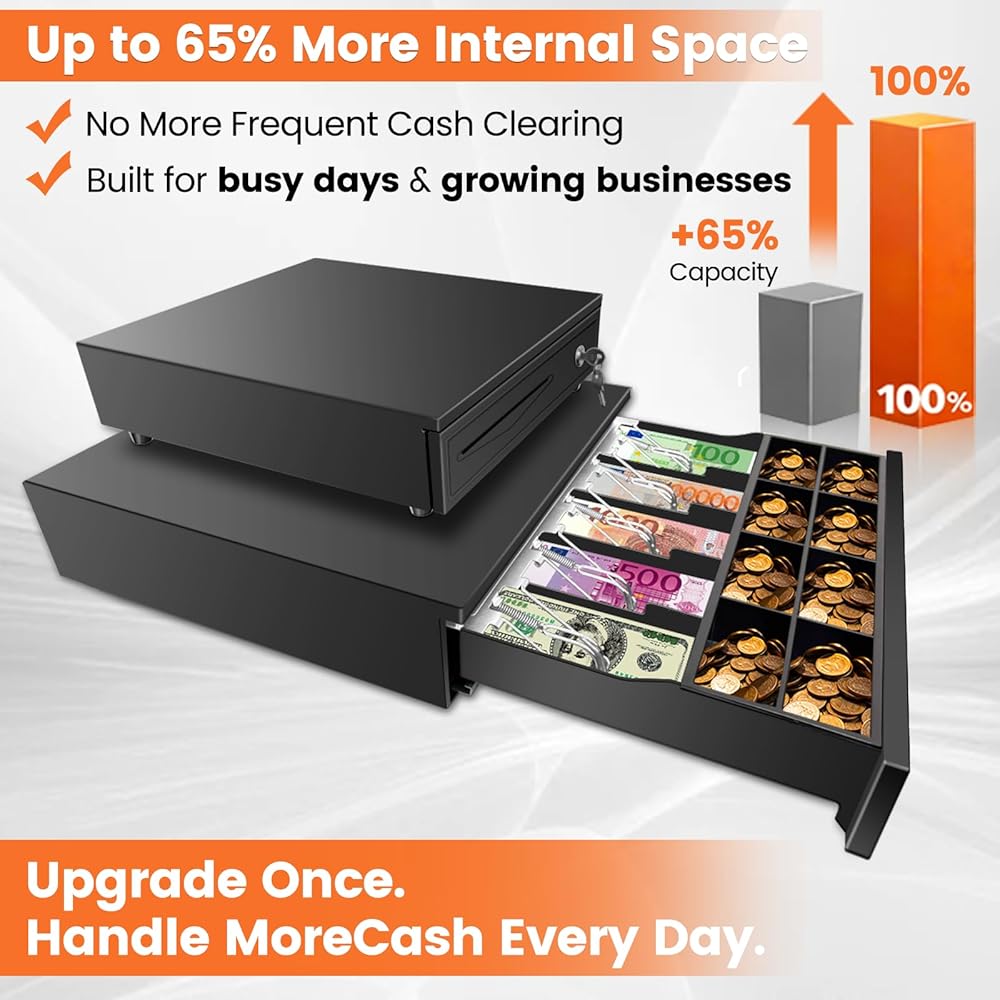 【مسجل نقدي كبير مقاس 16.4 بوصة】يقيس 16.4 بوصة × 15.6 بوصة × 3.5 بوصة ويدعم إدخال الجهد الكهربي العريض 12-24 فولت تيار مستمر. توفر مساحة داخلية أكبر بنسبة تصل إلى 65% مقارنة بأدراج النقود القياسية. مثالي للشركات الصغيرة وتجار التجزئة المتناميين الذين يتعاملون مع أكثر من 50 معاملة يوميًا، مما يلغي الحاجة إلى الترقيات المستقبلية مع توسع أعمالك