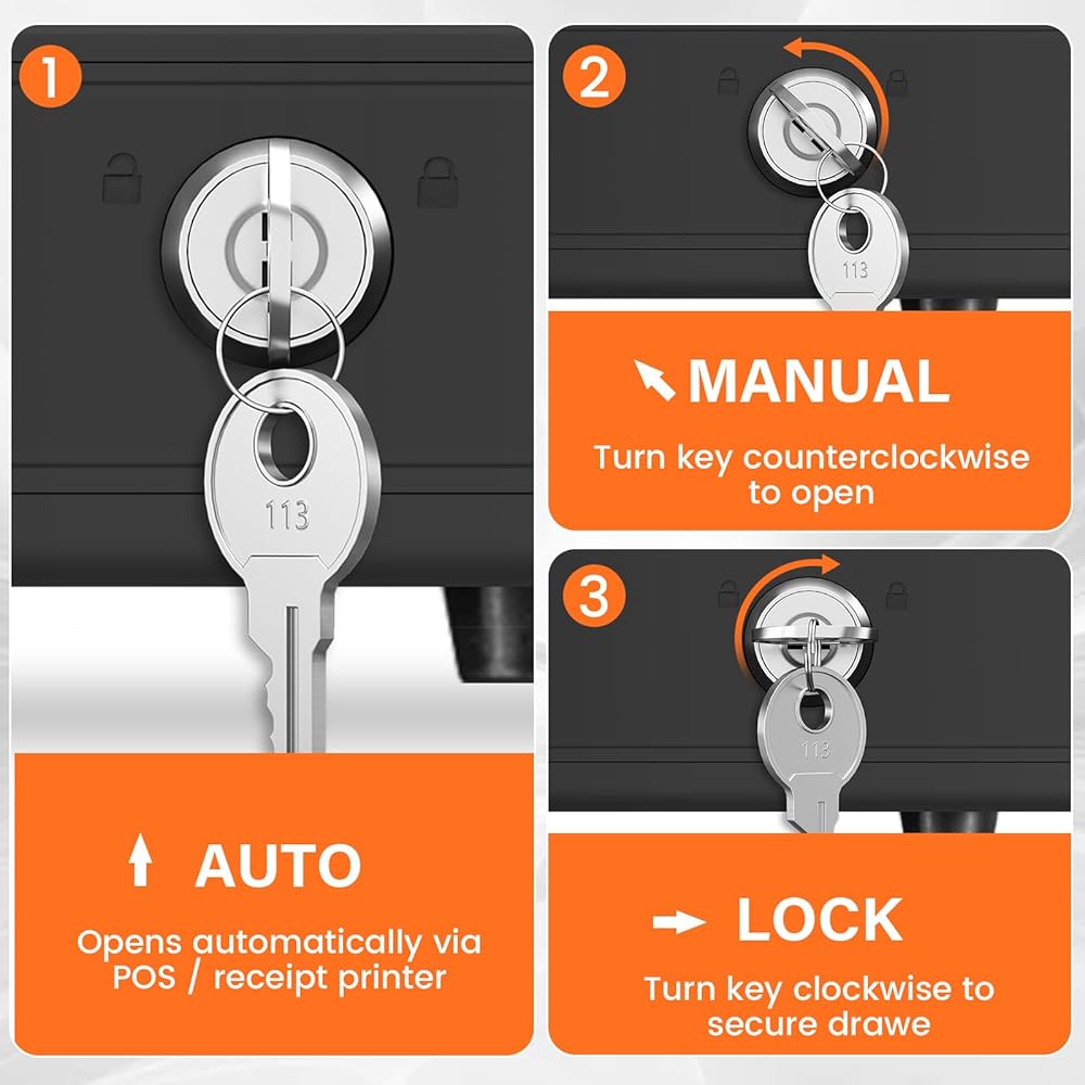 【أمان قفل المفاتيح بـ 3 مواضع】تم تصميم درج النقود هذا بهيكل فولاذي عالي التحمل وقفل مضاد للفك، ويتميز بقفل مفتاح ثلاثي المواضع: فتح يدوي، وفتح تلقائي عبر نظام الطابعة/نقطة البيع، ووضع القفل الكامل - مما يضمن أقصى قدر من الأمان والوصول المتحكم فيه في العمليات التجارية اليومية