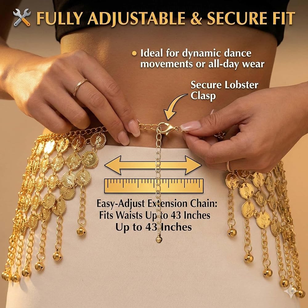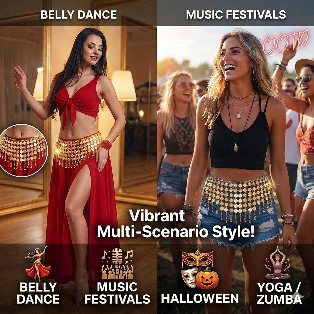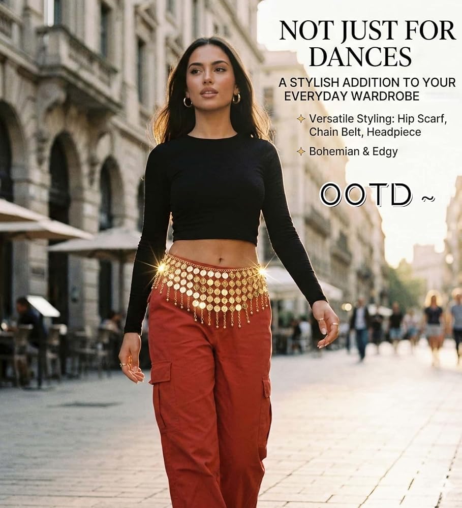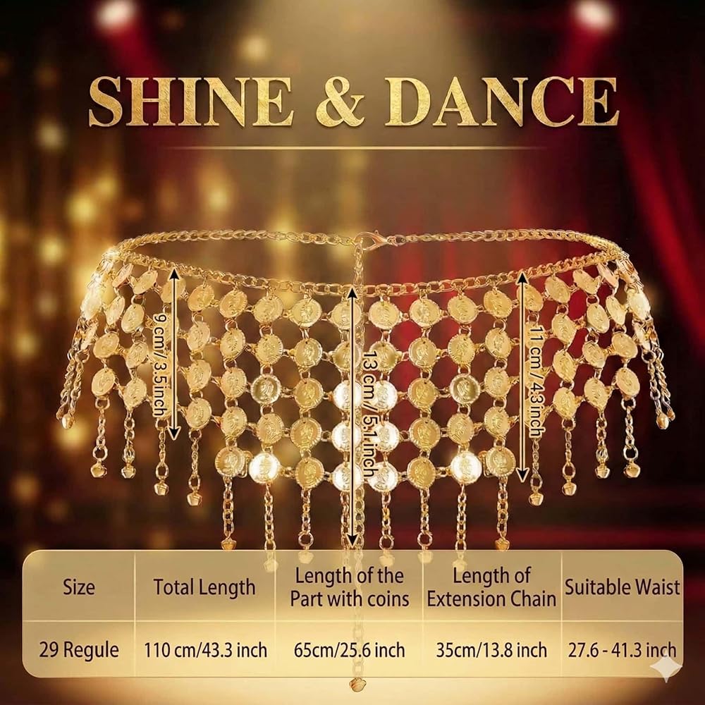1.128 Gold Coins Belly Dance Hip Scarf Belt - Adjustable Metallic Chain Belt for Belly Dancing, Halloween Costume, Music Festival & Performance 2.Sparkle for Dance, Fitness & Stage Performance: Ideal for enhancing your belly dance, Indian, or Latin moves. Also perfect for Zumba, yoga, and dazzling on stage. The shimmer and sound elevate any performance. 3.128 Glittering Coins – Dazzling Shine & Sound Captivate everyone with 128 shiny gold coins! They create a mesmerizing light show and a rhythmic jingle with every move, making your belly dance or performance truly unforgettable. 4. Fully Adjustable for a Perfect & Secure Fit This versatile scarf belt easily adjusts to fit most waists (up to 43 inches). Wear it comfortably as a hip chain or wrap skirt for dance practice or as a fashion statement.