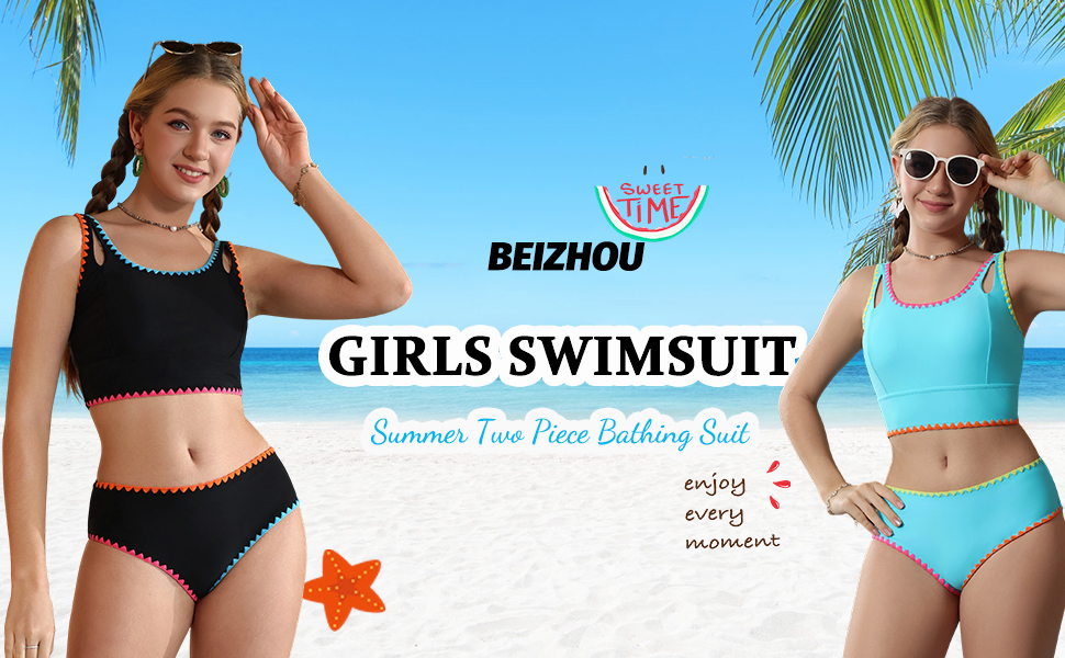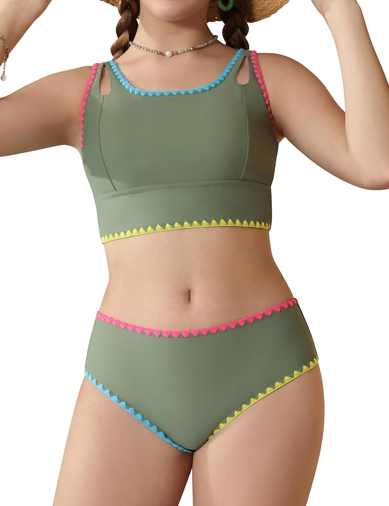 • طقم سباحة مكون من قطعتين: يتضمن قطعة بيكيني علوية واحدة وقطعة سفلية عالية الخصر. يسهل تنسيقه مع القبعات أو النظارات الشمسية أو أغطية الرأس أو الواقيات من الطفح الجلدي، مما يجعله خيارًا متعدد الاستخدامات لملابس السباحة لمظهر صيفي لطيف ورياضي. سوف تحصل فتياتك على الكثير من الإطراء!