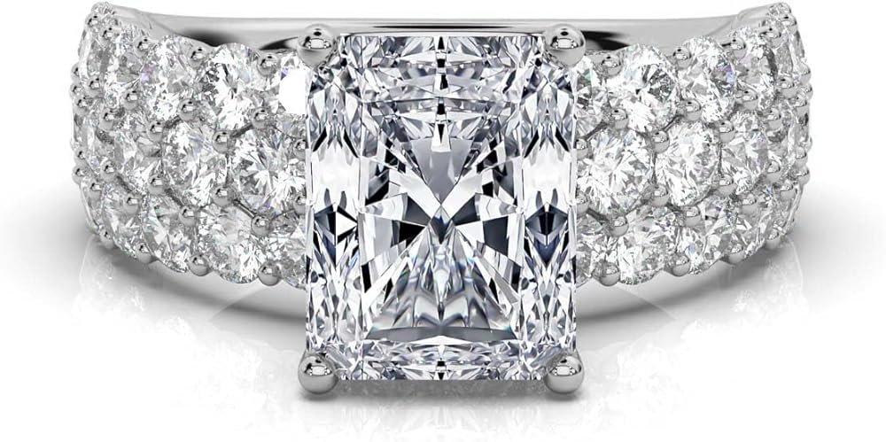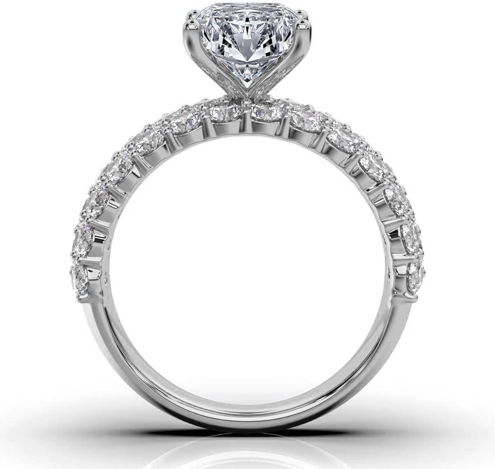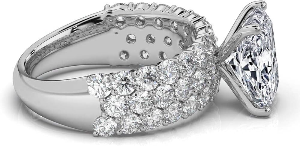 تفاصيل الحجر: - الحجر الرئيسي: مويسانيتي، شكل الحجر الرئيسي: قطع لامع مشع، وزن الحجر الرئيسي: 5 قيراط (11 × 9 مم) تقريبًا. لون الحجر الرئيسي: عديم اللون، وضوح الحجر الرئيسي: VVS، بريق الحجر الرئيسي: ممتاز،| الحجر الجانبي: قطع دائري، لون الحجر/النقاء: أبيض/VVS1، وزن الحجر الجانبي: 0.50 قيراط تقريبًا.