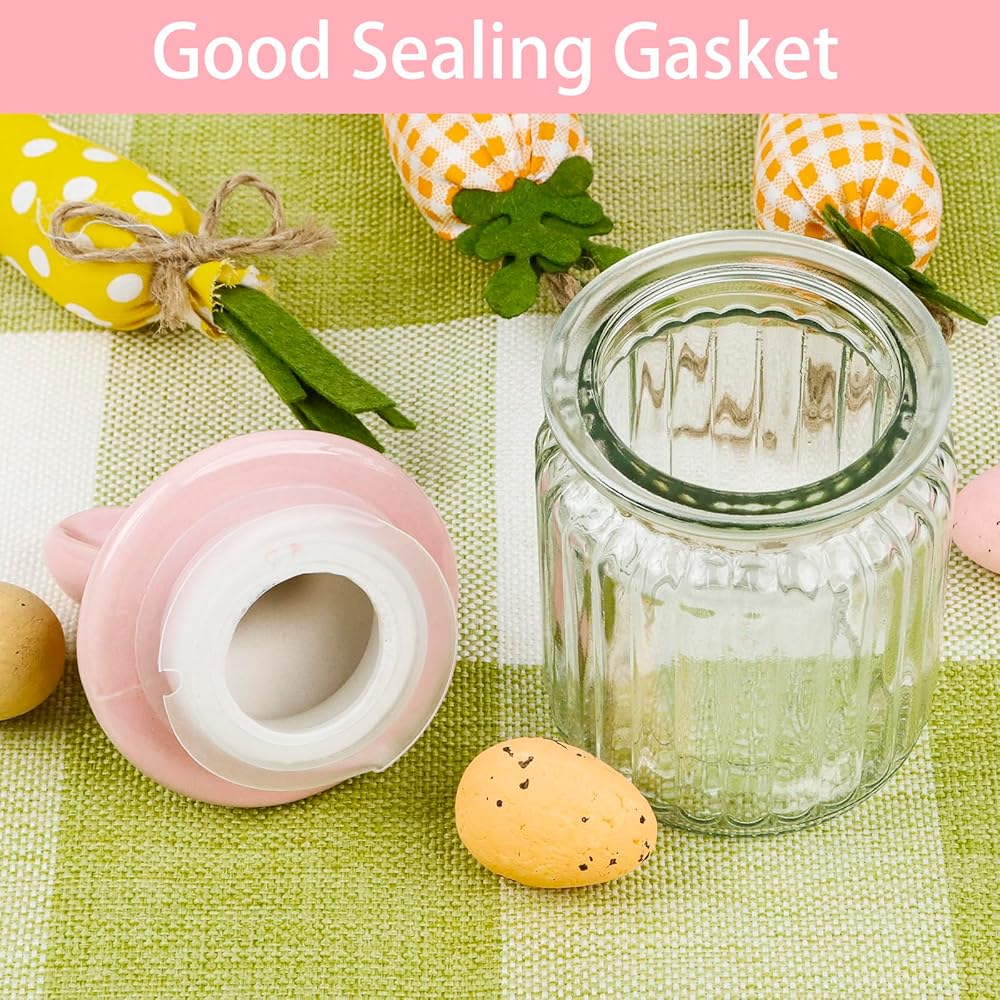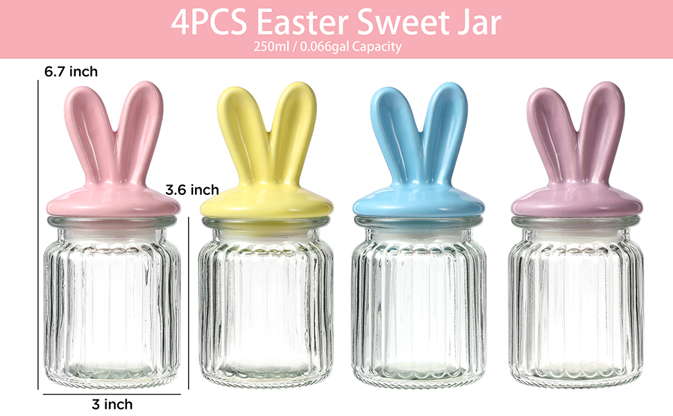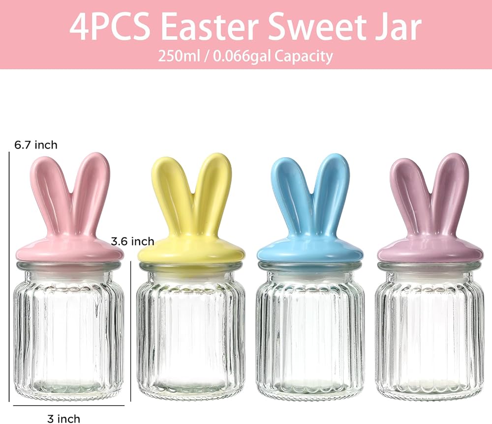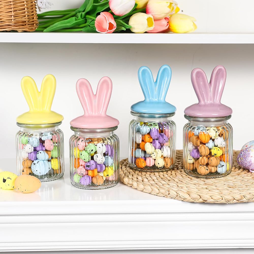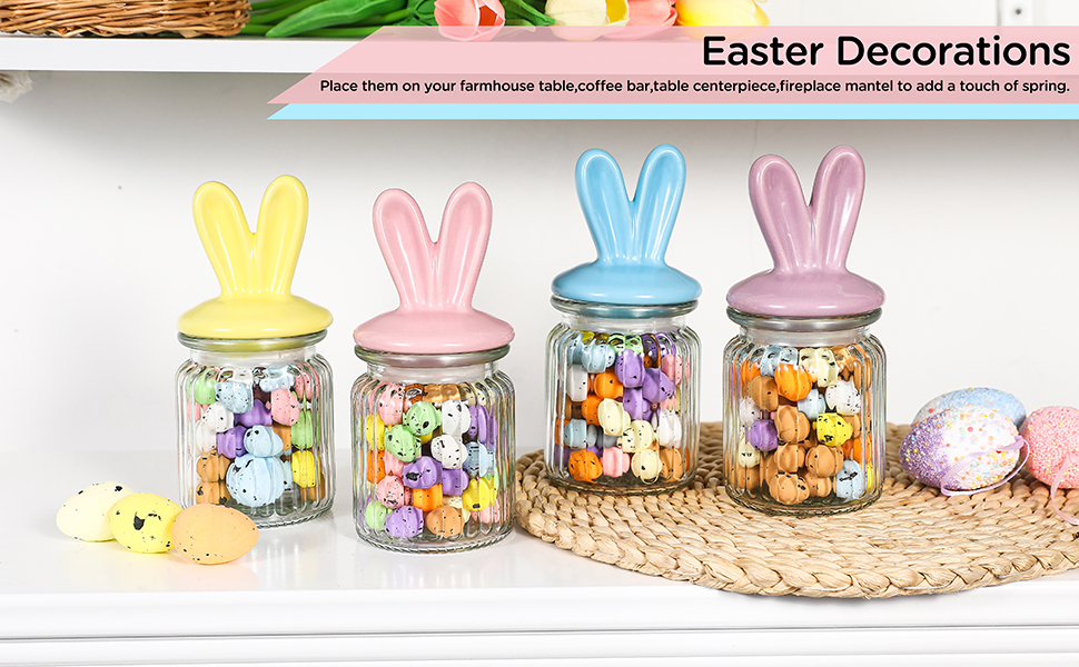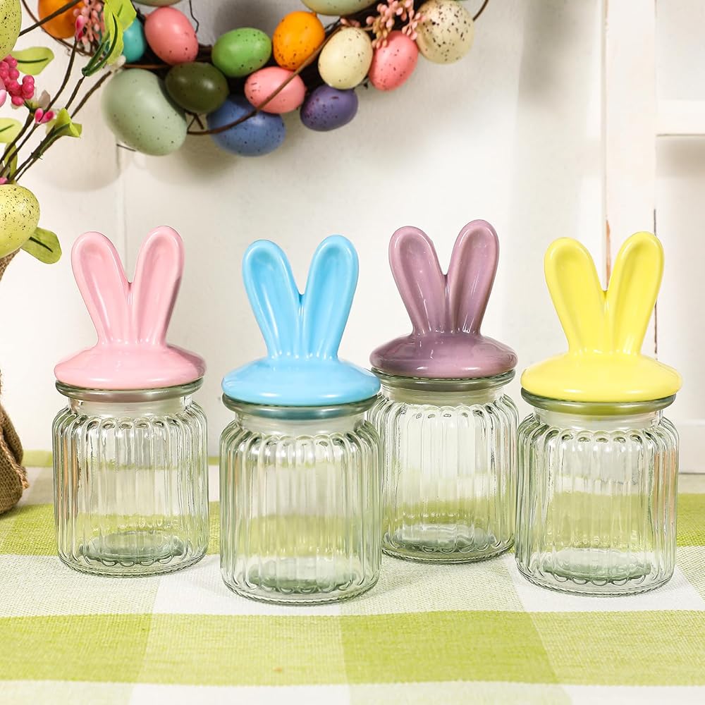 زينة عيد الفصح - 4 قطع من الجرار الزجاجية مع غطاء أذن أرنب من السيراميك - تخزين زجاجي لعيد الفصح لحلوى الشوكولاتة والحلويات هدية صغيرة لتزيين طاولة البيض