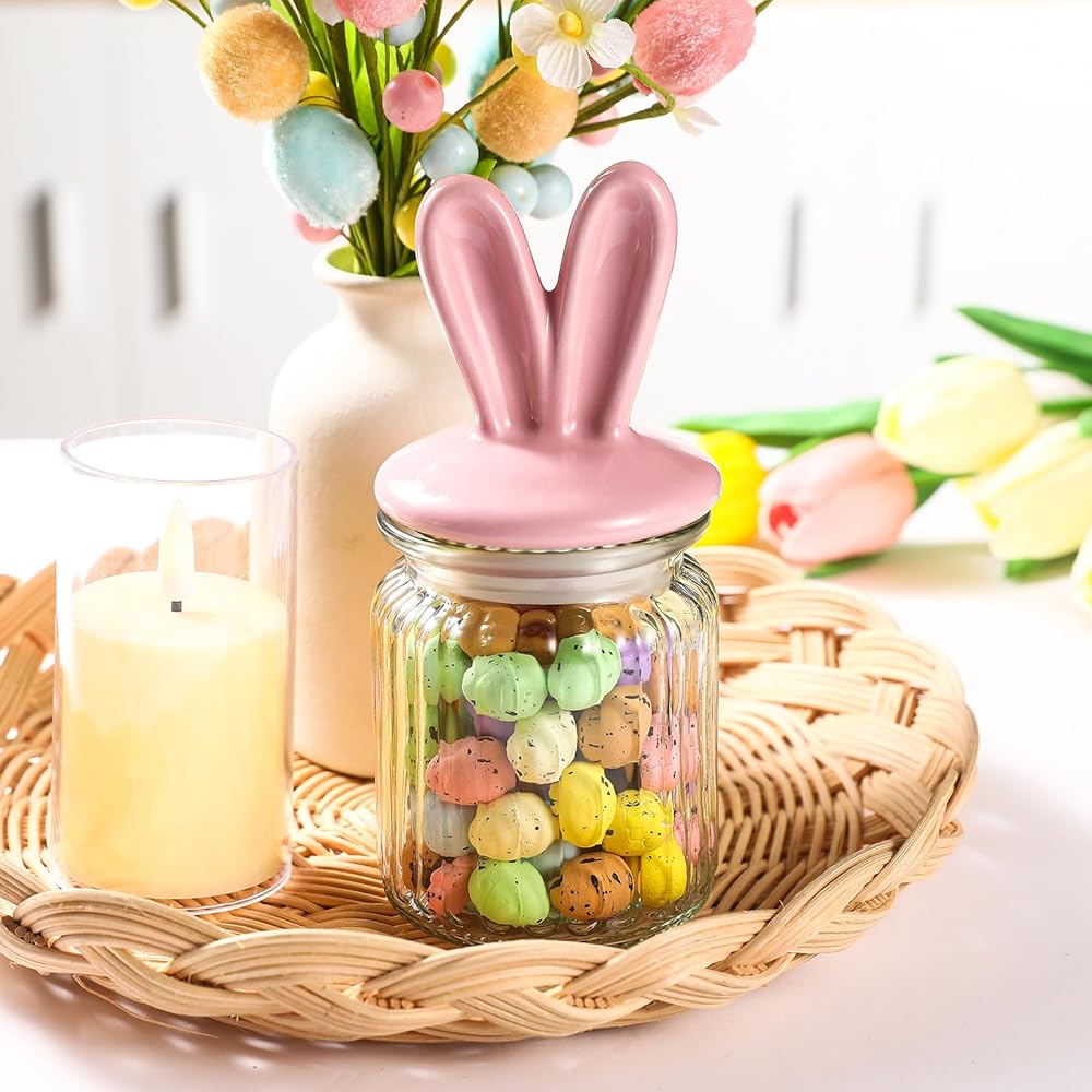 يأتي البرطمان الزجاجي على شكل أذن الأرنب بأربعة ألوان مبهجة، بما في ذلك الوردي والأزرق والأصفر والأرجواني. تتميز الأغطية الخزفية بآذان أرنب عيد الفصح الرائعة، وستضفي لمسة من الفرح الربيعي على أي مساحة.