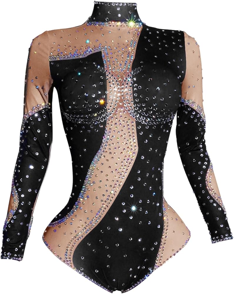 DESIGN FEATURES: Long sleeve High neck bodysuit with glittering rhinestone embellishments and eye-catching Black and red patchwork colors perfect for performances