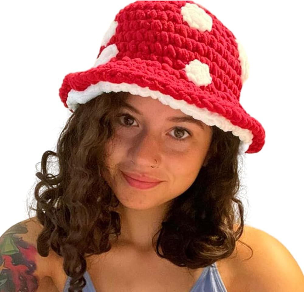 Stand outat any with this hand knitted Mushroom Hat. for Halloween or cosplay enthusiasts.