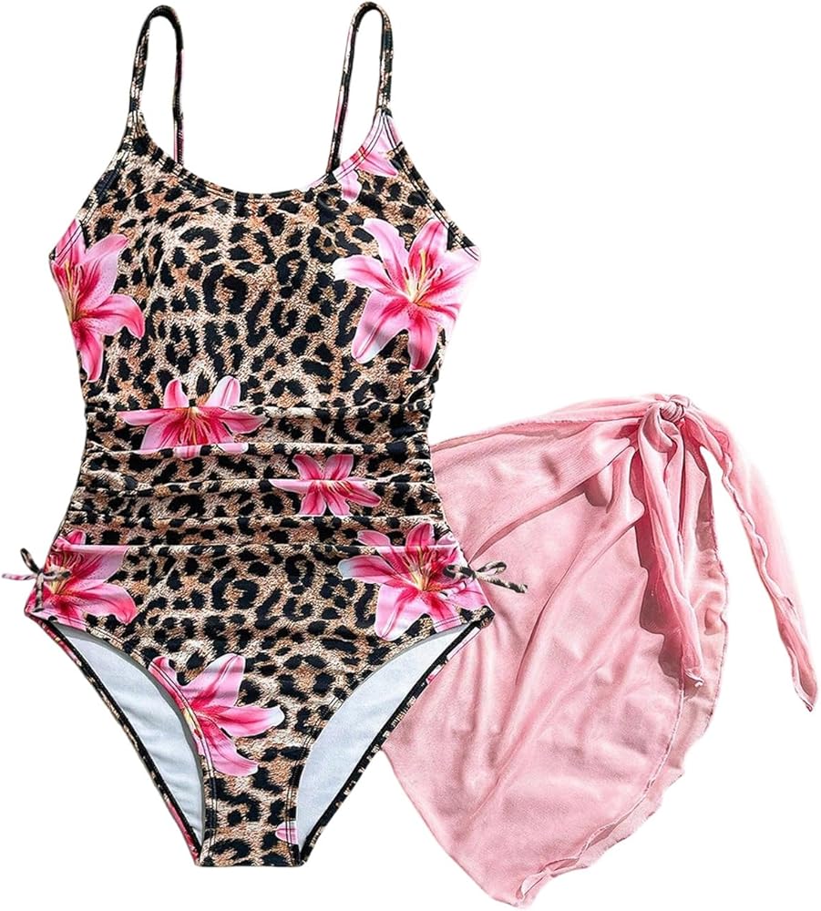 • Features: One piece bathing suit with cover up for girls, leopard and floral print, adjustable spaghetti straps, drawstring ruched sides, scoop neck, mesh sarong wrap