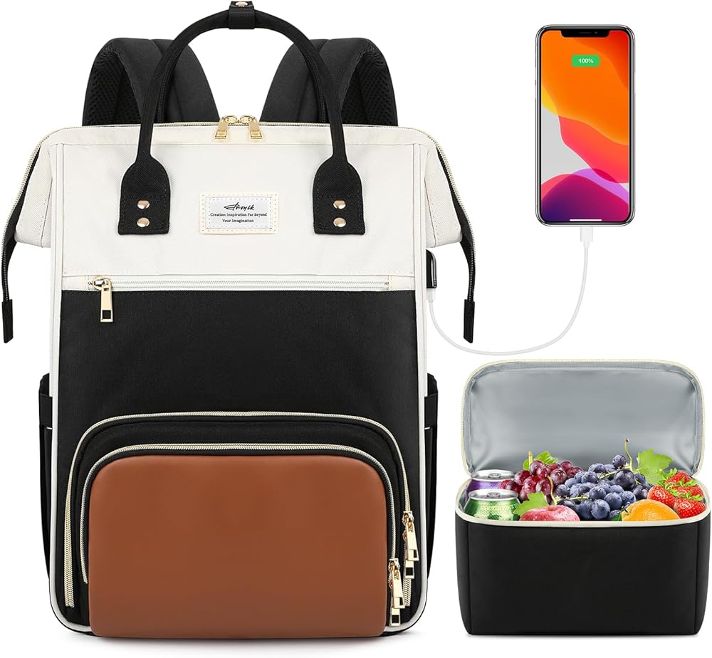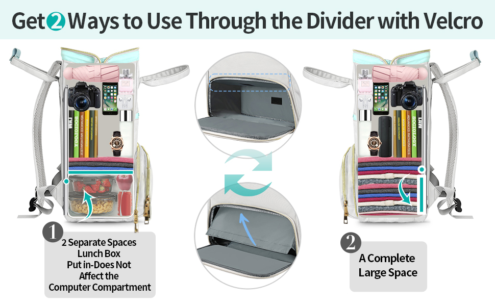 حقيبة ظهر بتصميم 2 في 1 للنساء يمكن استخدامها كحقيبة غداء أو حقيبة ظهر للكمبيوتر المحمول. عندما تقوم بتخزين الطعام أو الفاكهة في حقيبة الغداء، سيتم تقليل مساحة الحجرة الرئيسية لتوفير مساحة أكبر لحجرة الطعام. تحتوي اللوحة الداخلية القابلة للطي على دعم مدمج لمنع سحق الطعام بواسطة الأشياء الثقيلة. عندما لا تحتاج إلى حمل الطعام، يمكن طي الطبقة المعزولة حتى تتمكن من حمل المزيد من العناصر في الجيب الرئيسي. تعتبر حقيبة الغداء القابلة للفصل لمسة لطيفة أيضًا
