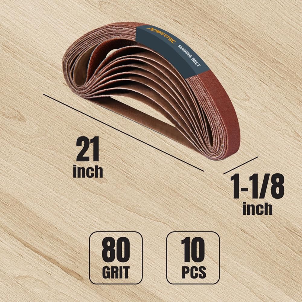 حزام السنفرة من أكسيد الألومنيوم من POWERTEC 412104 1-1/8 بوصة x 21 بوصة لساندر ماكيتا 9031 & 9032، 10 عبوات