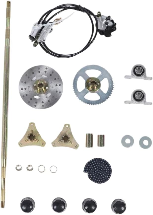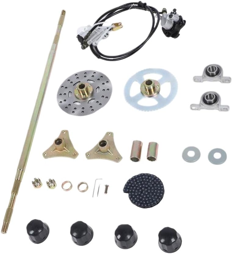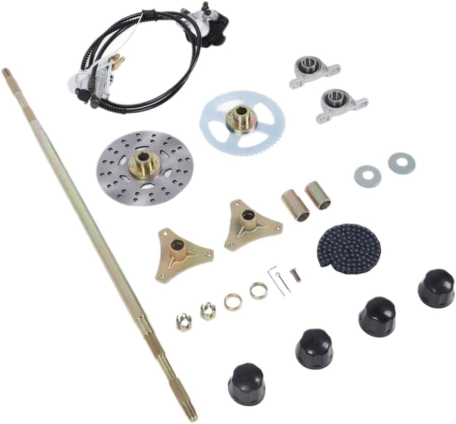 29in Go Kart Rear Live Axle Assembly Kit Axle Sprocket Chain Brake Disc Caliper Wheel Hubs Replacement for 50cc 70cc 90cc ATV Quad This rear live axle assembly kit is designed for go karts and compatible with 50cc 70cc 90cc ATVs and.It includes a complete axle, sprocket, chain, brake disc, caliper, and wheel hubs.The 29-inch configuration supports power transmission and braking performance.Components are built to fit standard rear axle setups and provide under regular use.The kit allows straightforward replacement of worn or damaged rear axle parts.It integrates with existing drivetrain and brake systems for consistent functionality.