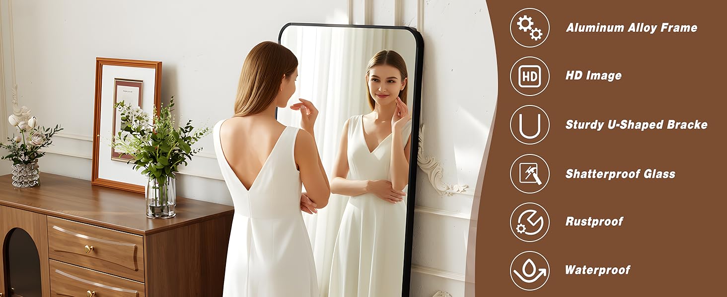 سهولة التركيب والدعم: تأتي المرآة بطول الأرضية مع حامل مثبت مسبقًا ومجموعة تثبيت على الحائط من أجل إعداد سريع وخالي من المتاعب. إذا كانت لديك أي أسئلة، فإن فريق دعم العملاء لدينا جاهز دائمًا للمساعدة