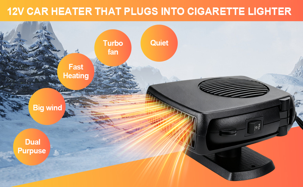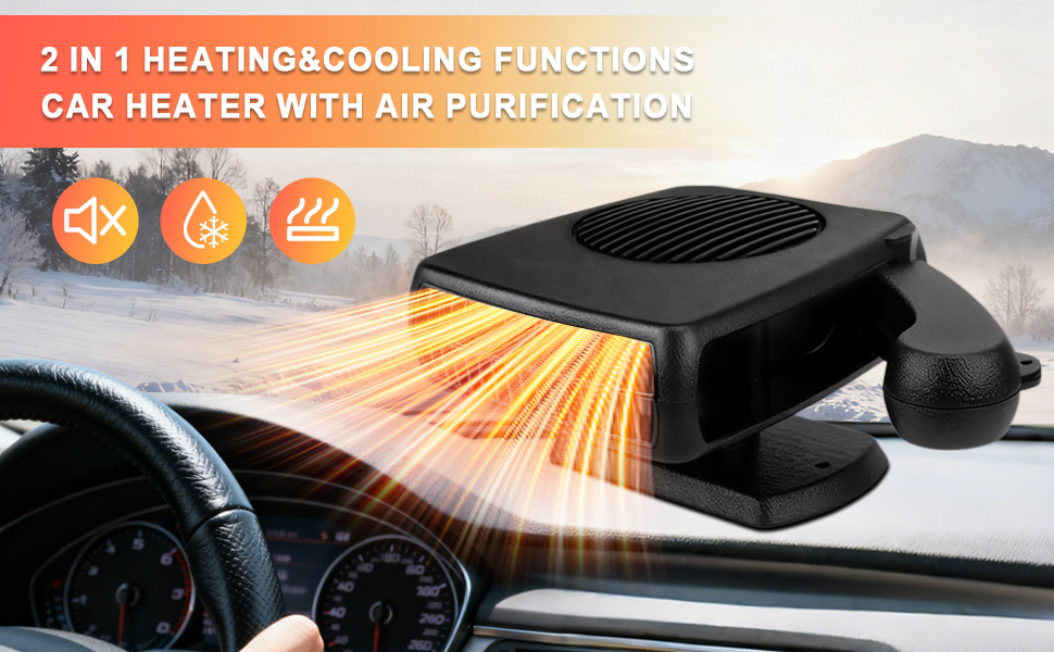 【قابل للدوران 360 درجة】يأتي سخان السيارة المحمول هذا مع حامل دوار 360 درجة مصمم لتعديل مجاني. يمكنك ضبط المدفأة للسماح للهواء الدافئ بالنفخ في المكان الذي تريده. ضعه على حصيرة غير قابلة للانزلاق أو ثبته بشريط على الوجهين.