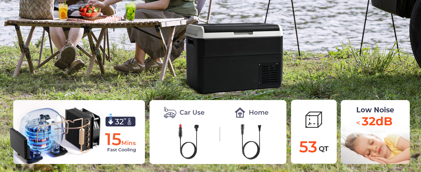 • التبريد السريع وECO/MAX: مجهزة بضاغط عالي الأداء، يمكن لثلاجة السيارة 12 فولت أن تبرد بسرعة إلى درجة الحرارة المرغوبة خلال 15 دقيقة فقط على وضع MAX. يساعد وضع ECO على تقليل استهلاك الطاقة، مما يضمن تشغيل ثلاجتك المحمولة بكفاءة أثناء الرحلات الطويلة