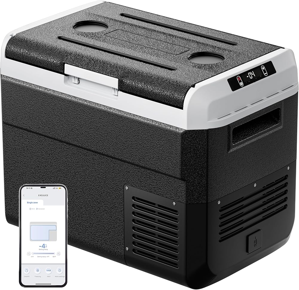 • سعة كبيرة وتصميم وظيفي: توفر ثلاجة السيارة المحمولة EKOJUCE مساحة تخزين واسعة للحفاظ على طعامك ومشروباتك طازجة أثناء السير على الطريق. يتميز هذا الفريزر المحمول بفتحتين للأجهزة الإلكترونية وحاملي الأكواب، مما يجعله خيارًا مناسبًا للشاحنات والمركبات الترفيهية ومركبات الطرق الوعرة والمعسكرات والشاحنات الصغيرة والقوارب