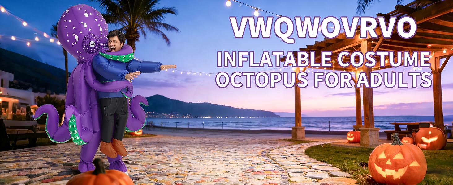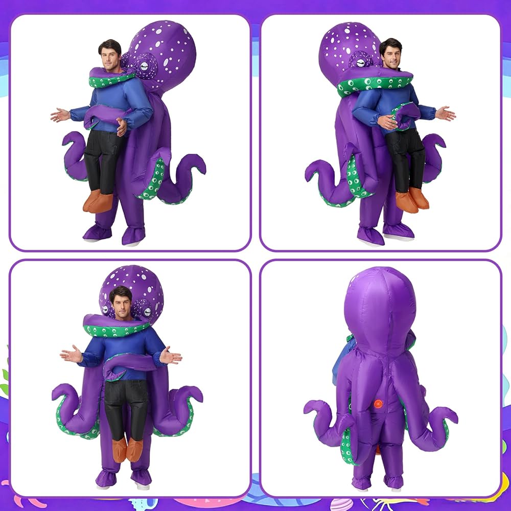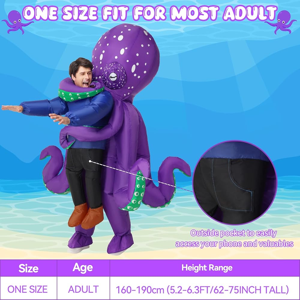 【متضمنة】يتضمن زينا القابل للنفخ للبالغين زي أخطبوط واحد قابل للنفخ، ومروحة واحدة، وصندوق بطارية واحد. (يتطلب صندوق البطارية 4 بطاريات AA، وهي غير متضمنة.)