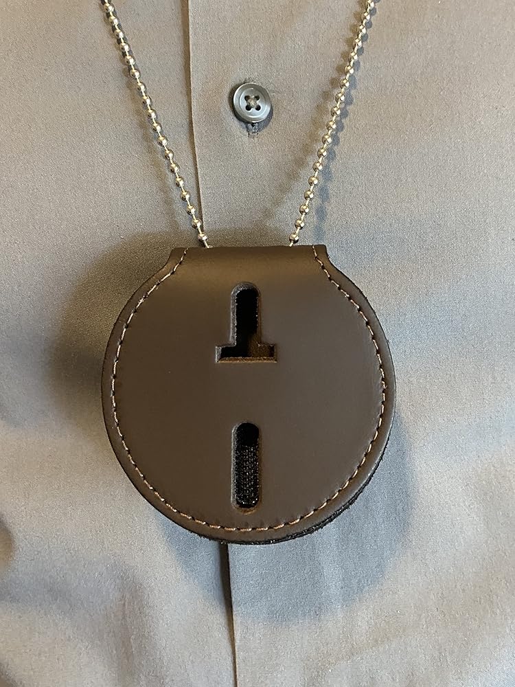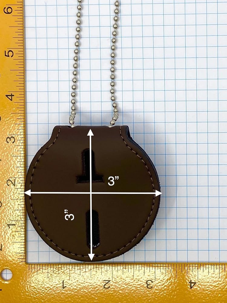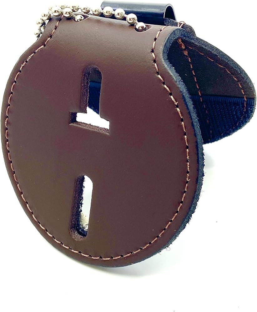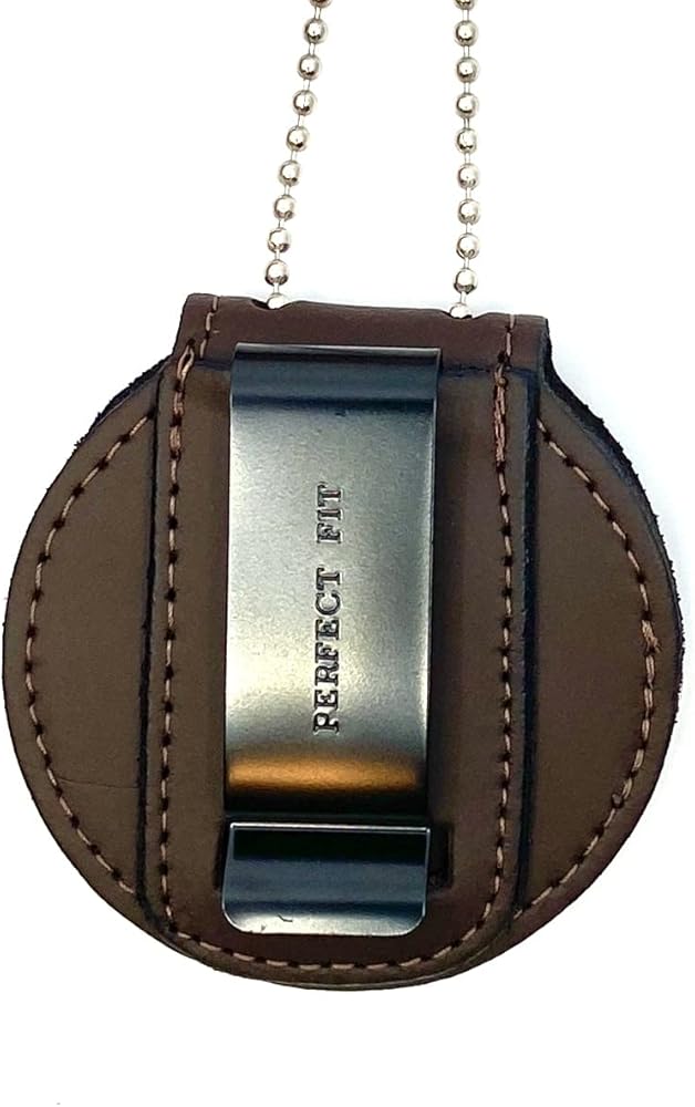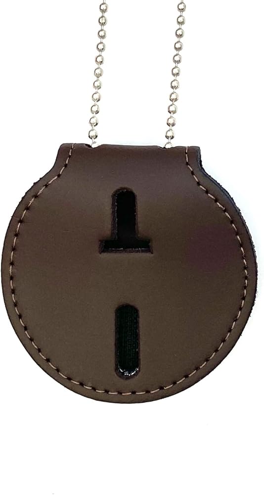 محافظ درع مناسبة تمامًا، حامل شارة شرطة دائري عالمي مع مشبك حزام معدني وقلادة سلسلة من الخرز، إغلاق بخطاف وحلقة، جلد بني