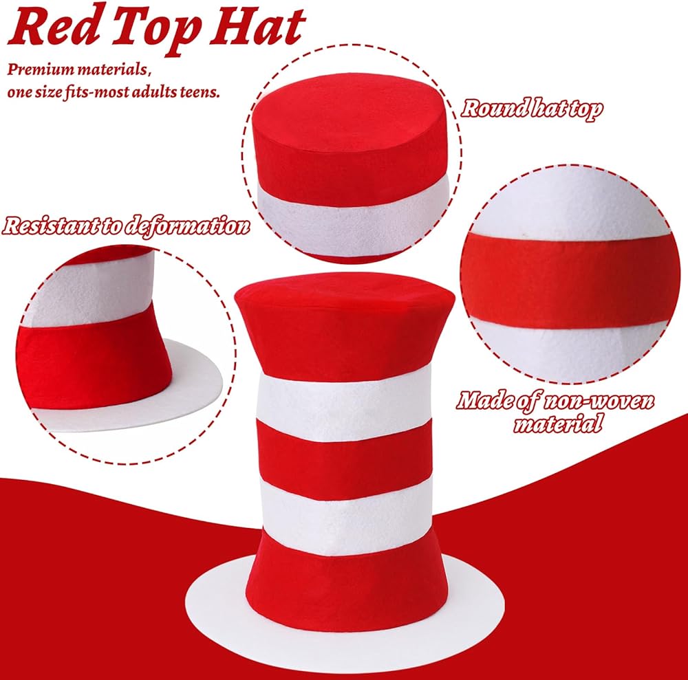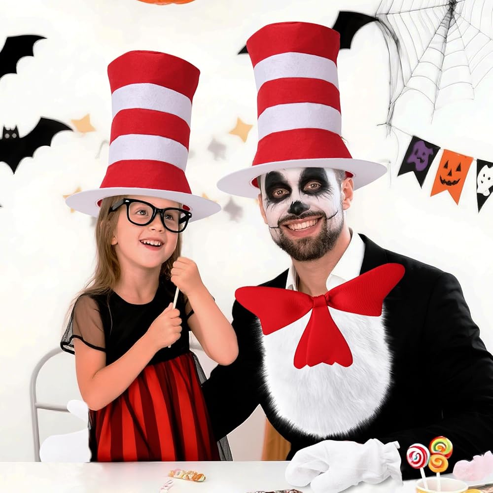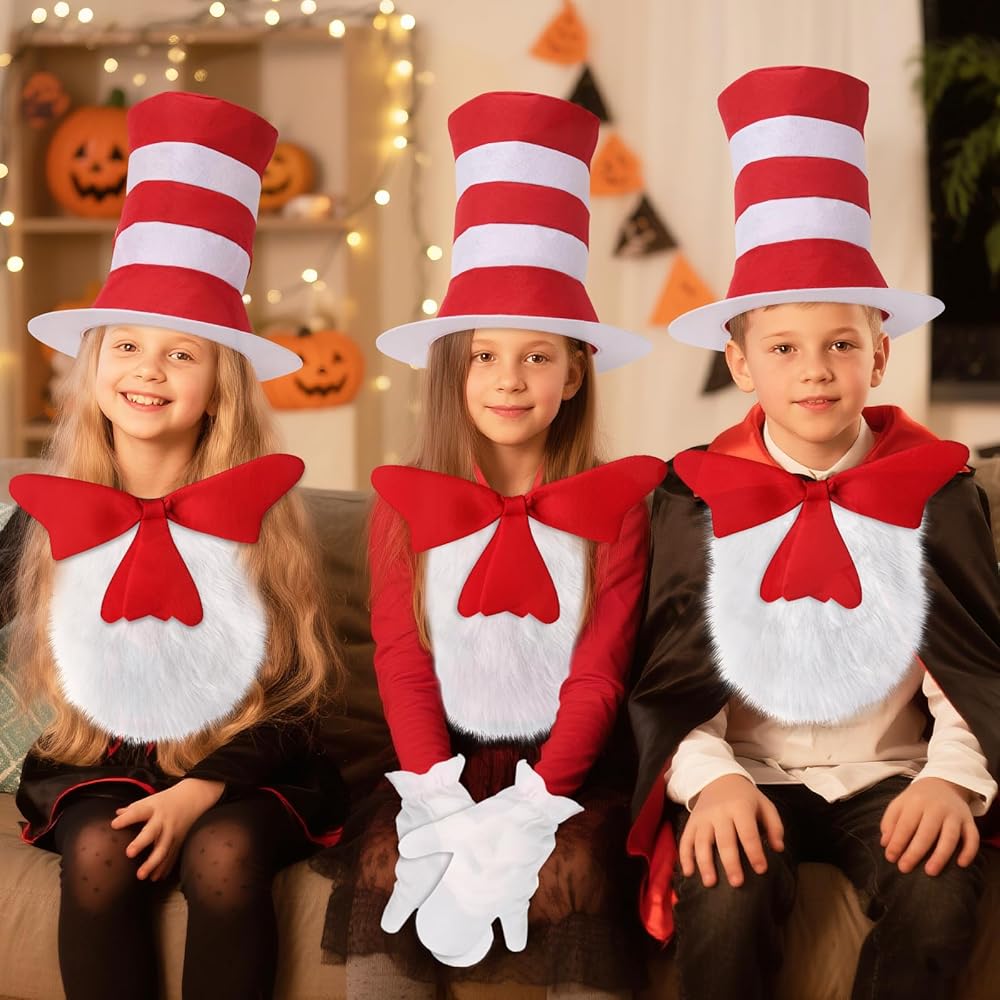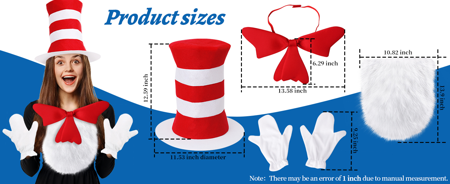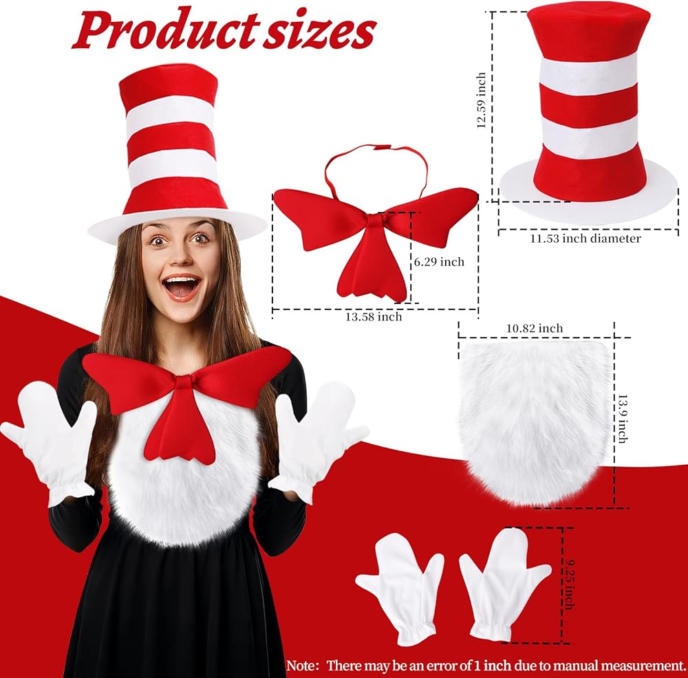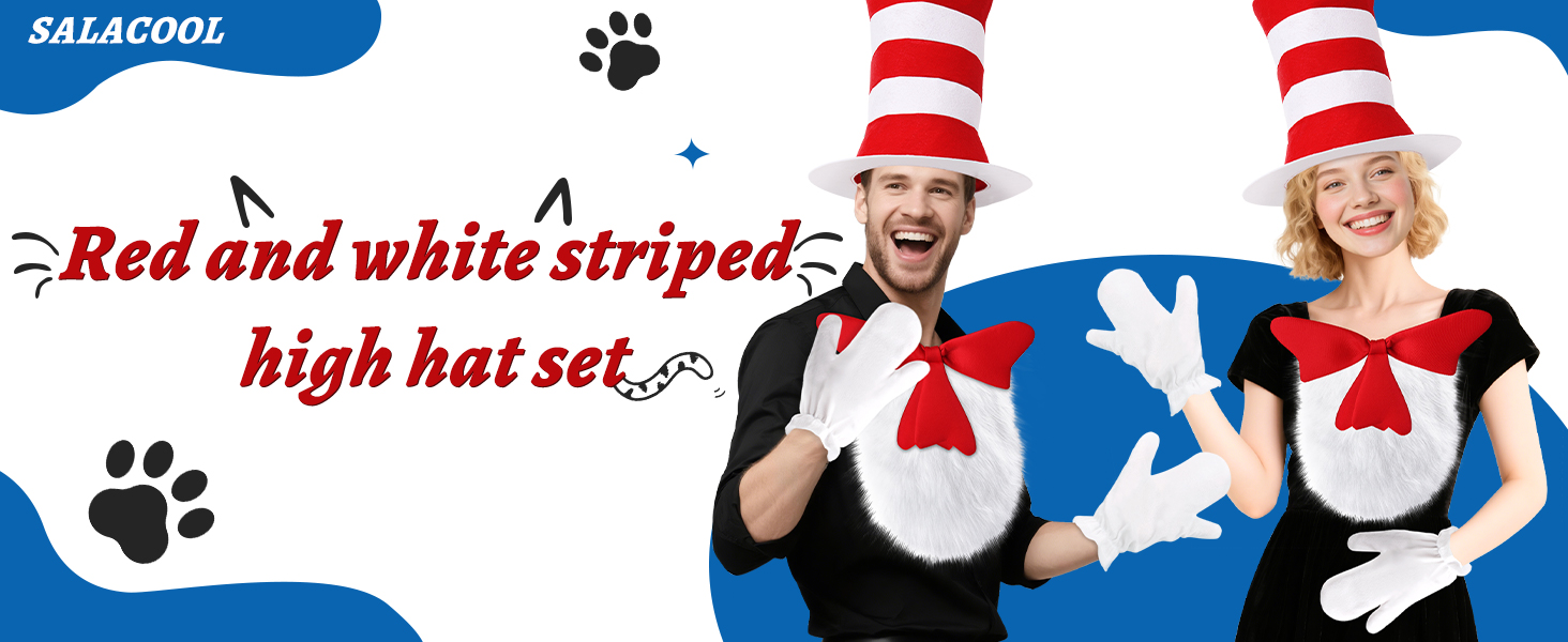 أزياء شخصيات الكتاب: تتميز بقبعة مخططة كلاسيكية باللونين الأحمر والأبيض، وربطة عنق حمراء وفراء أبيض لتصميم متعدد الاستخدامات 2 في 1، ويتوافق بسهولة مع أنماط الأزياء المختلفة؛ وتتوافق مع قفازات بيضاء لإكمال أزياء شخصيات كتاب القصة