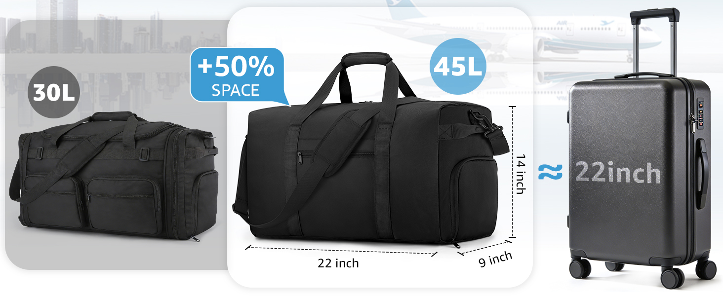 حقيبة كبيرة من القماش الخشن للسفر: سعة 45 لترًا بأبعاد 22 × 14 × 9 بوصة، والتي يمكن أن تحل محل الأمتعة المحمولة مقاس 22 بوصة لرحلاتك. توفر حقيبة السفر الشخصية هذه مساحة تخزين واسعة لتخزين كمية كبيرة من المعدات ومجموعات متعددة من الملابس والأشياء الكبيرة، كما أنها تحافظ على جميع متعلقاتك منظمة بشكل أنيق. عند عدم الاستخدام، يمكن طيها بشكل مسطح للتخزين المدمج