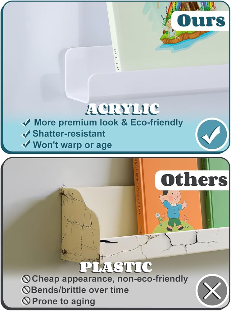 Durable Thick Acrylic: Made from 3mm thick acrylic, the shelf is sturdy yet lightweight, resistant to wear, and easy to clean. A protective film is applied for shipping—please remove it before use for a clear, smooth finish