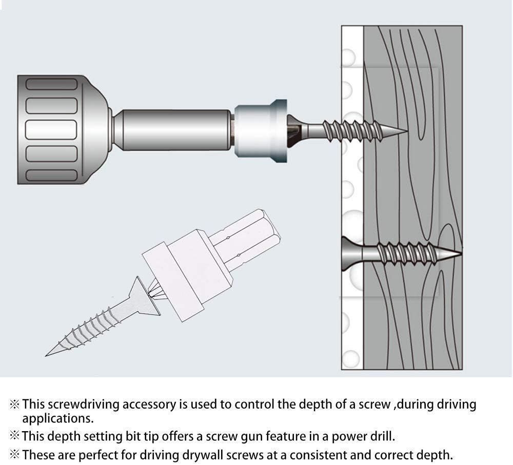 تتضمن أيضًا 10 قطع من أدوات تثبيت براغي الحوائط الجافة. يستخدم ملحق مفك البراغي هذا للتحكم في عمق المسمار أثناء تطبيقات القيادة. يوفر رأس رأس ضبط العمق هذا ميزة مسدس البراغي في المثقاب الكهربائي. مثالية لقيادة براغي الجدران الجافة بعمق ثابت وصحيح.