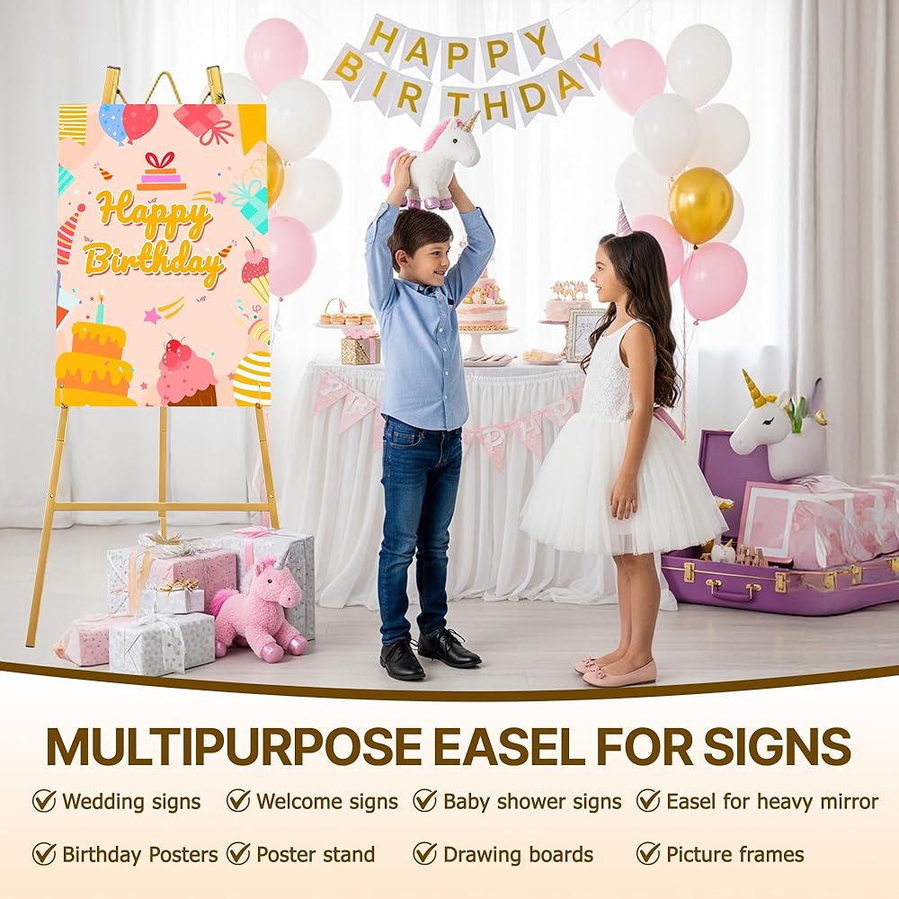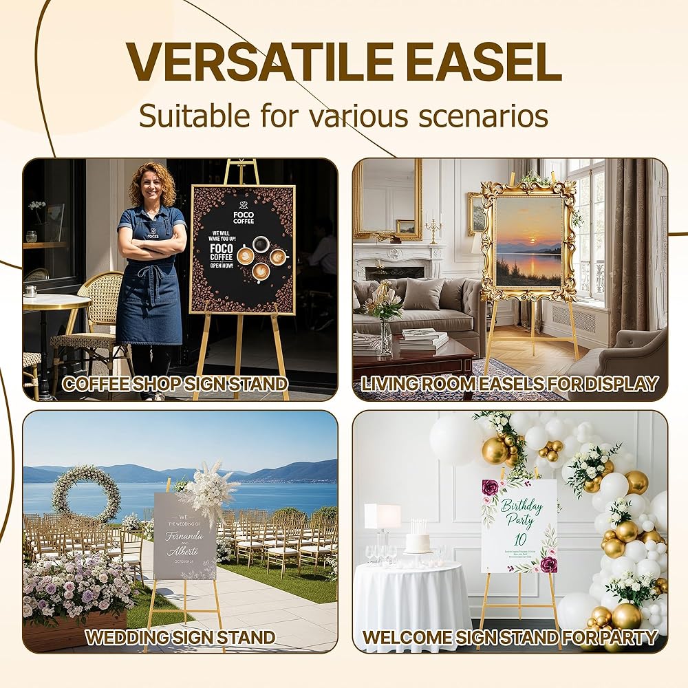 This large easel isn't just for weddings—it's a multi-purpose easel display stand that transitions effortlessly from special events to daily use. Use it as a sign easel stand for promotional posters in your shop, a gold easel stand for sign displays at baby showers or birthday parties, or even as a decorative piece in your home to showcase family photo collages or favorite artworks.